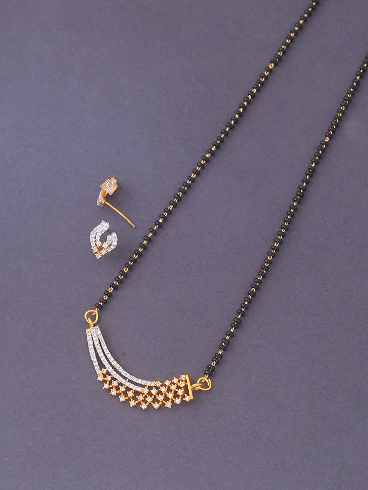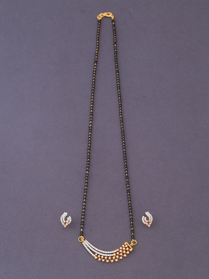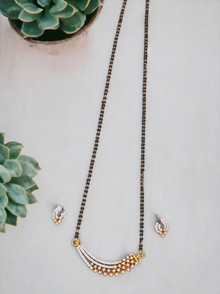 Give the typical Mangal Sutra a new and classy look. Make this necessary jewellery a fashion statement with this gorgeously crafted AD Mangal Sutra that has glittering diamonds with a golden touch teamed with the auspicious black beads.