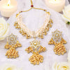 This necklace is the ultimate accessory option for the festive season. This set has a gorgeous circular floral pattern. The necklace has vibrant pearl detailing all over. The set also has a bright element of Kundan detailing in its structure. So, don't miss out on this gorgeous necklace set this eventful season as you have ramps to walk ahead.