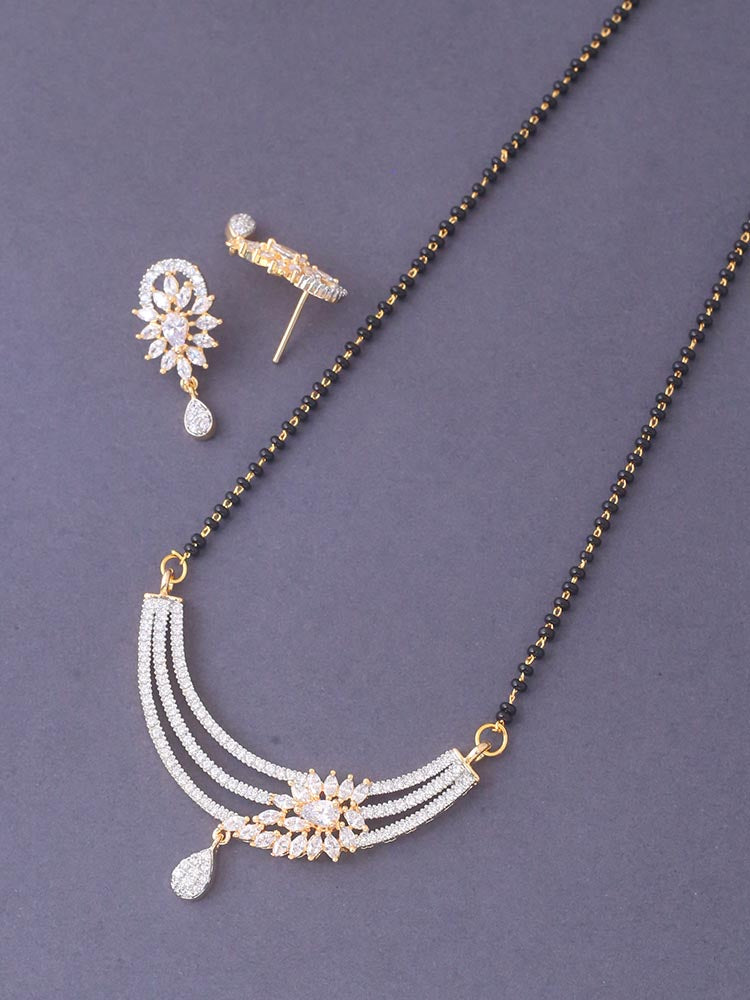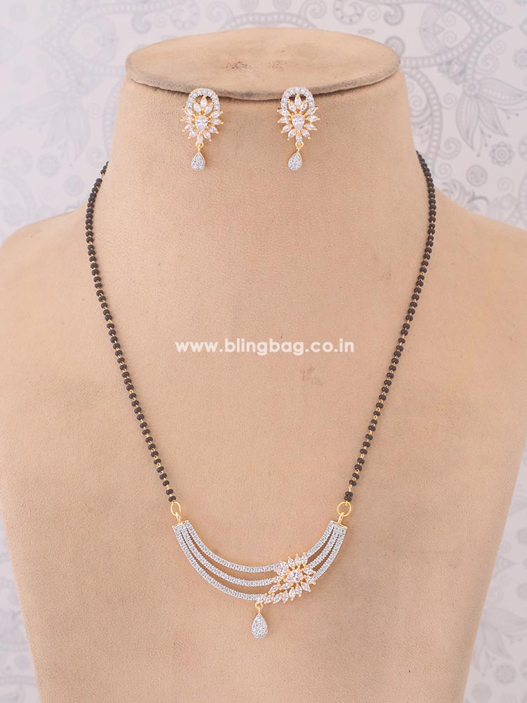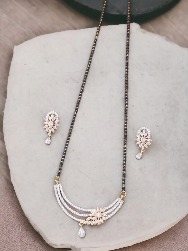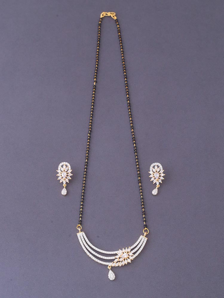 Give the typical Mangal Sutra a new and classy look. Make this necessary jewellery a fashion statement with this gorgeously crafted AD Mangal Sutra that has glittering diamonds with a golden touch teamed with the auspicious black beads.