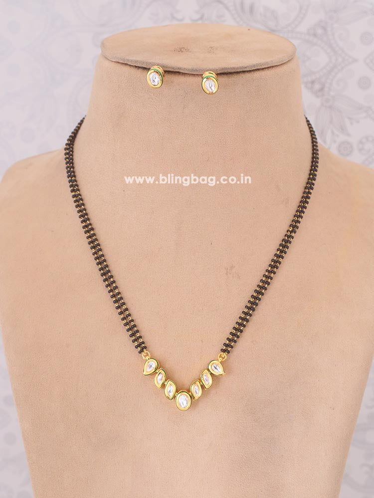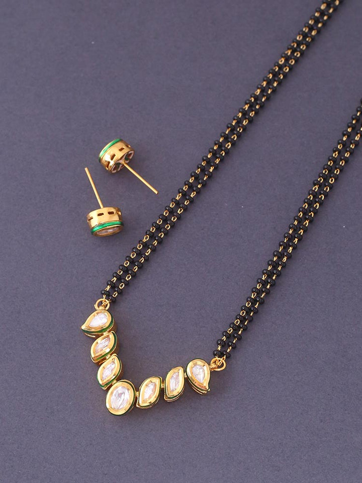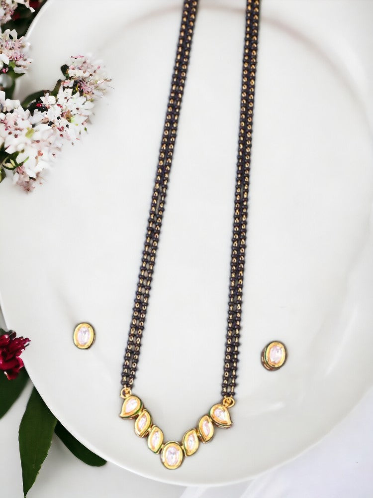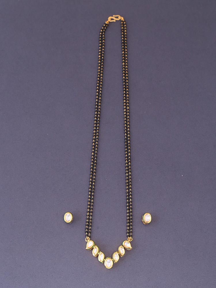 Give the typical Mangal Sutra a new and classy look. Make this necessary jewellery a fashion statement with this gorgeously crafted AD Mangal Sutra that has glittering diamonds with a golden touch teamed with the auspicious black beads.