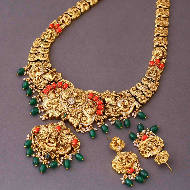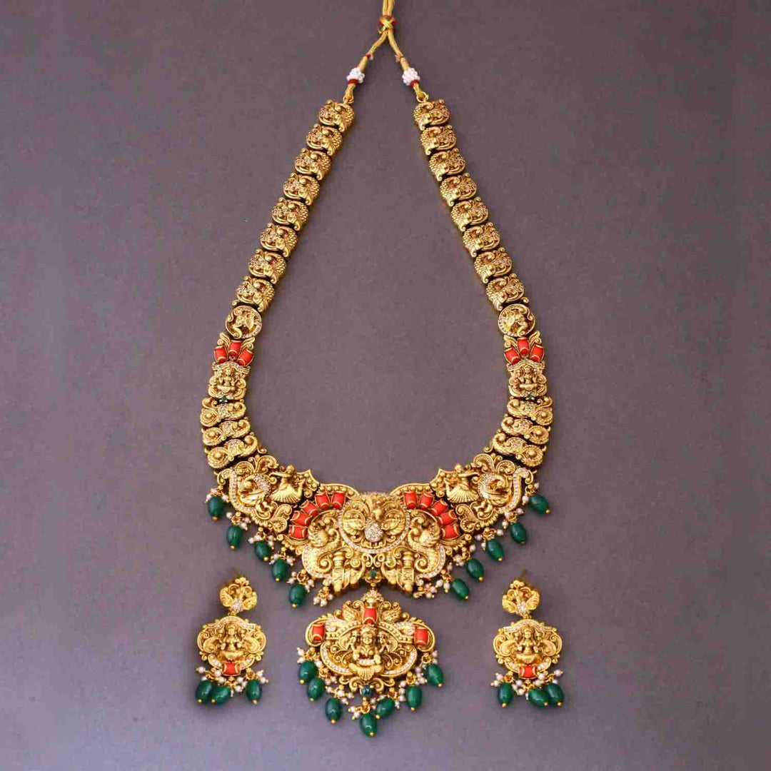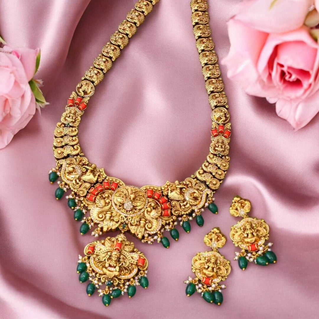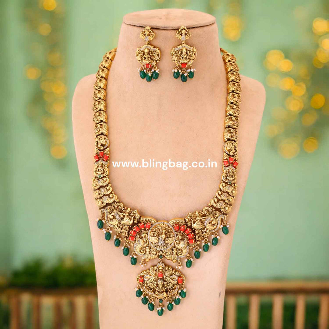 The temple necklace set epitomizes the grandeur and spiritual essence of Indian heritage, blending divine motifs with exquisite craftsmanship. Crafted with precision, each piece in the set showcases a harmonious blend of tradition and elegance.