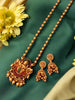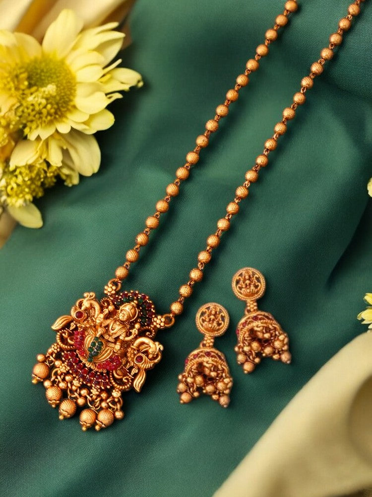 The temple necklace set epitomizes the grandeur and spiritual essence of Indian heritage, blending divine motifs with exquisite craftsmanship. Crafted with precision, each piece in the set showcases a harmonious blend of tradition and elegance.