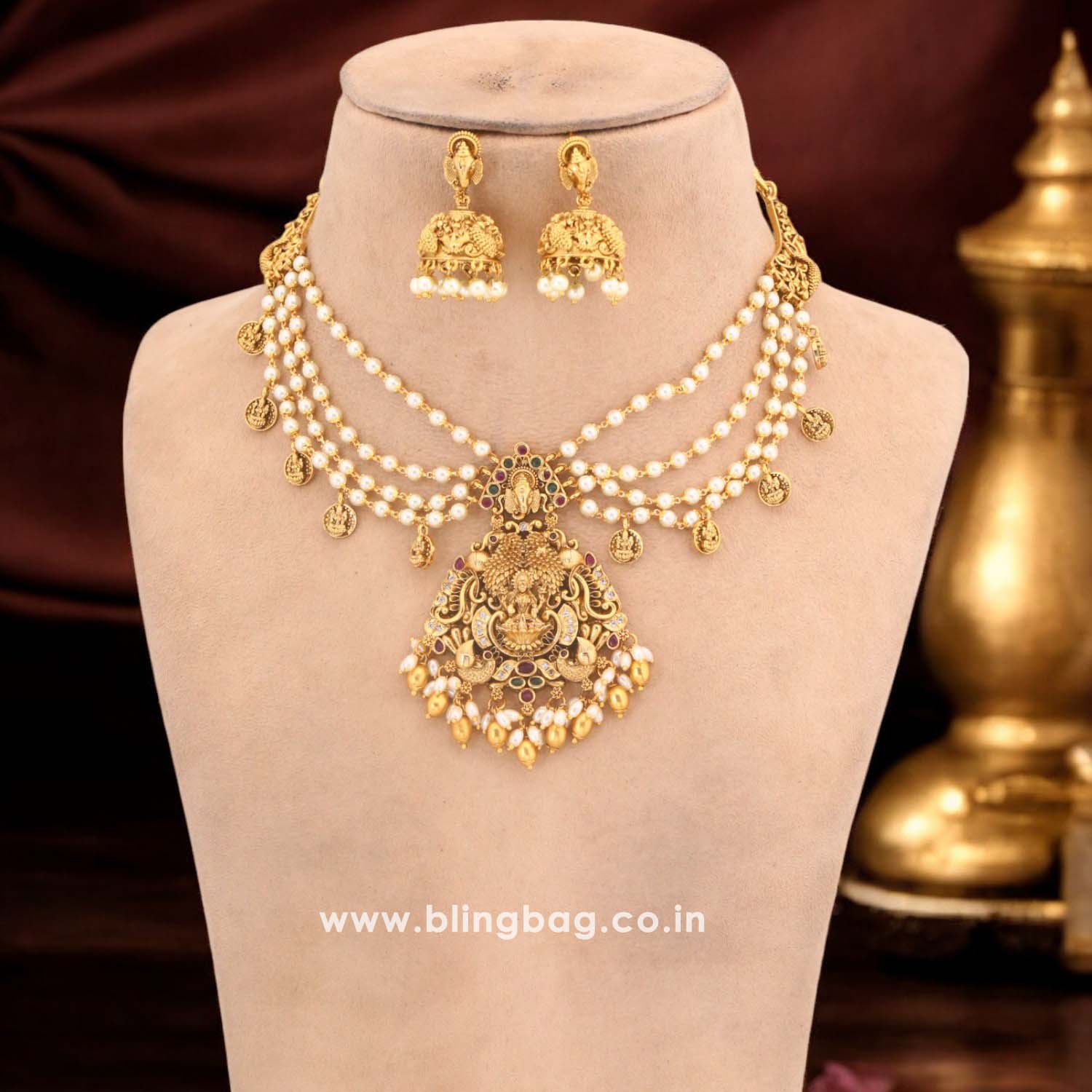 The temple necklace set epitomizes the grandeur and spiritual essence of Indian heritage, blending divine motifs with exquisite craftsmanship. Crafted with precision, each piece in the set showcases a harmonious blend of tradition and elegance.