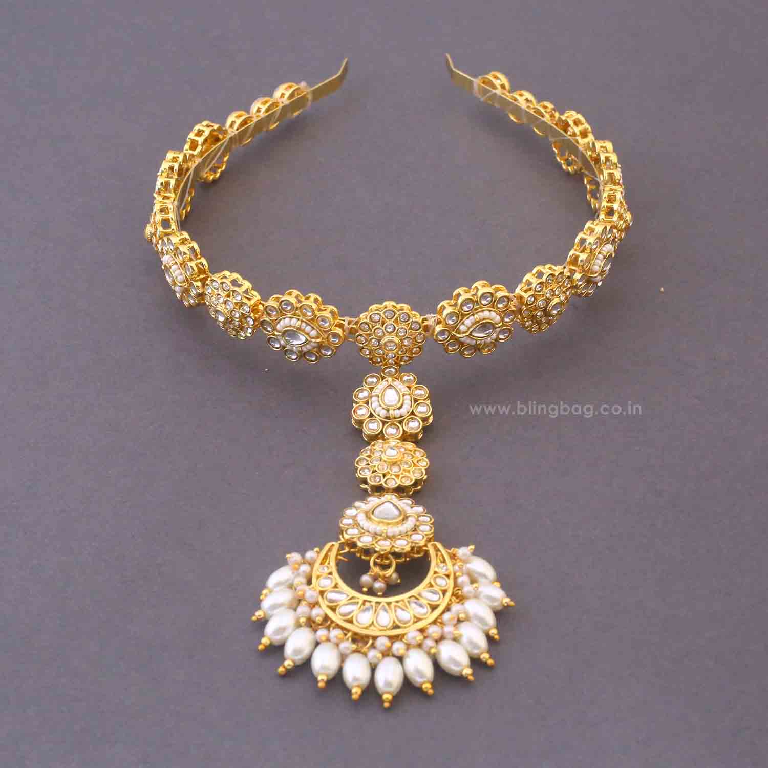 Designed to exude royal elegance, this headband with a tikka is a fusion of traditional charm and modern aesthetics. Adorned with intricate details, it gracefully complements bridal and festive looks, making it an essential accessory for grand occasions.