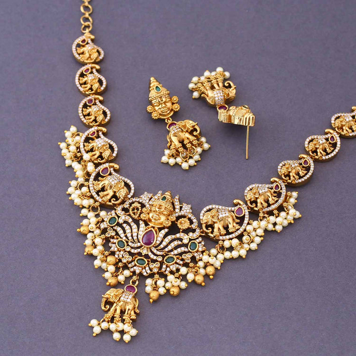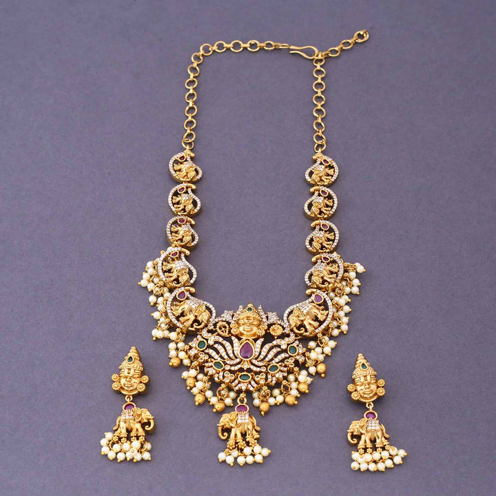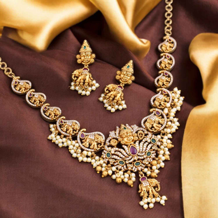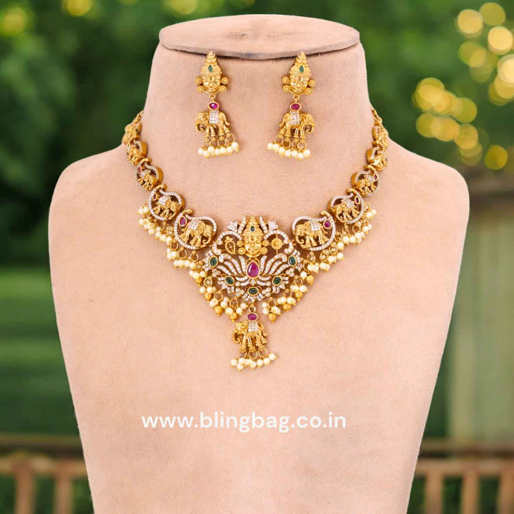 The temple necklace set epitomizes the grandeur and spiritual essence of Indian heritage, blending divine motifs with exquisite craftsmanship. Crafted with precision, each piece in the set showcases a harmonious blend of tradition and elegance.