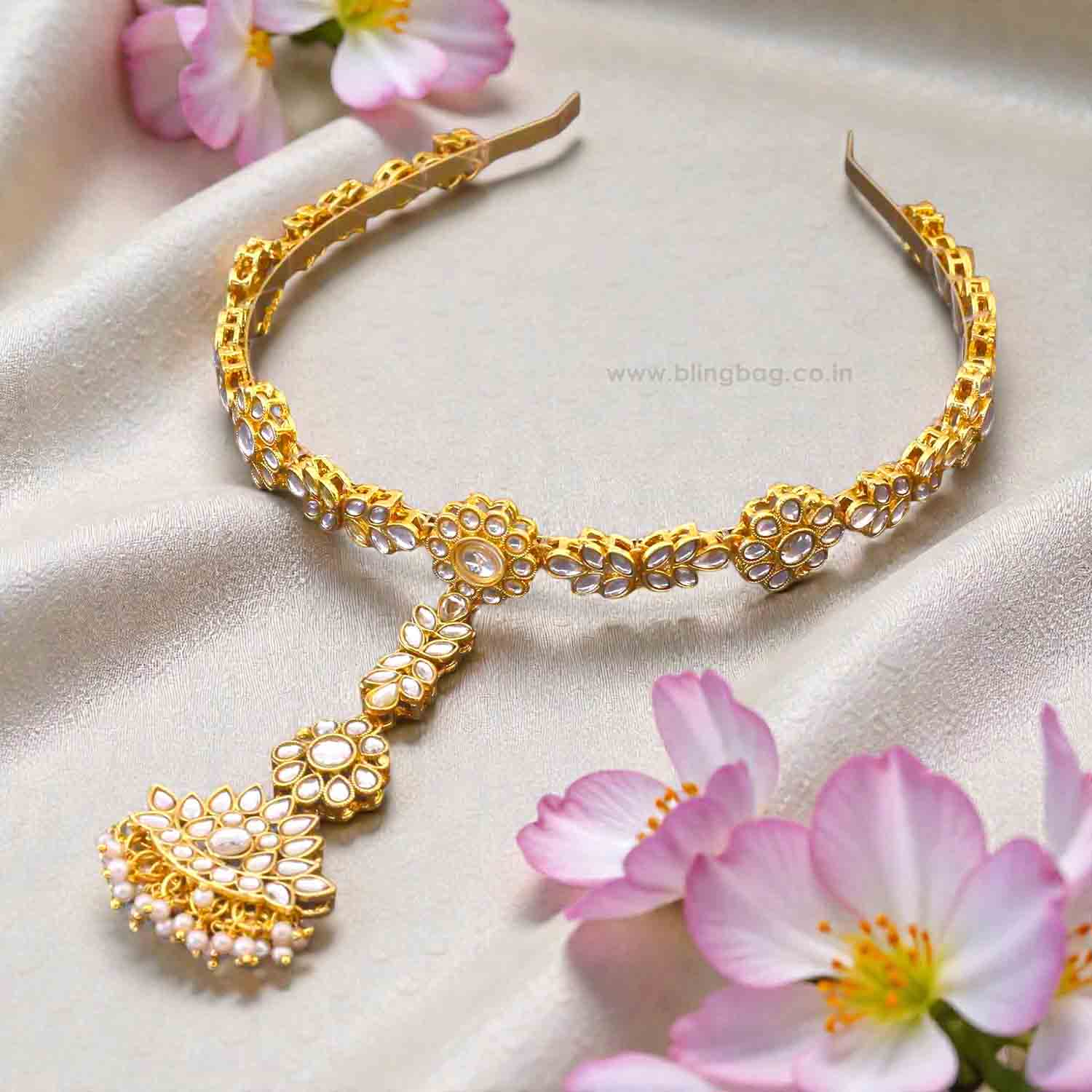 Designed to exude royal elegance, this headband with a tikka is a fusion of traditional charm and modern aesthetics. Adorned with intricate details, it gracefully complements bridal and festive looks, making it an essential accessory for grand occasions.