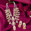 This necklace is the ultimate accessory option for the festive season. This set has a gorgeous circular floral pattern. The necklace has vibrant pearl detailing all over. The set also has a bright element of Kundan detailing in its structure. So, don't miss out on this gorgeous necklace set this eventful season as you have ramps to walk ahead.