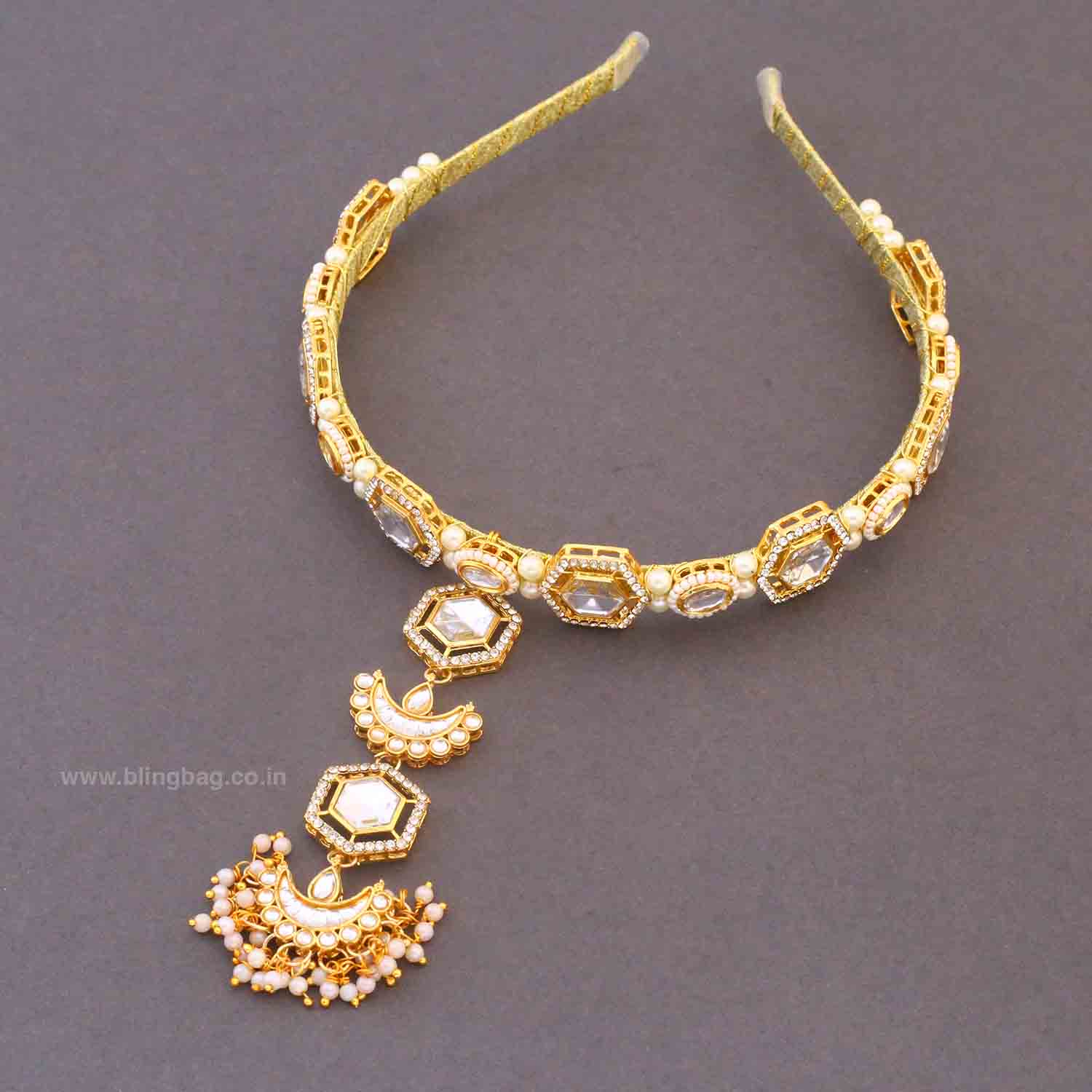 Pair this ornamental hairband with a saree or lehenga in jewel tones like sapphire, or burgundy for maximum impact. Layer it with minimal facial jewelry to let the hairband be your statement piece, and keep your makeup warm-toned with gold accents to complement the golden finish beautifully.