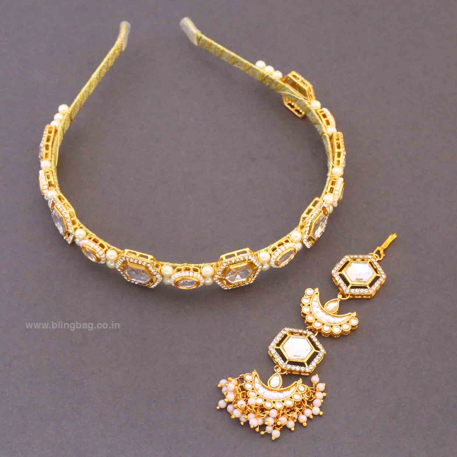 Elevate your festive look with this stunning golden hairband featuring an intricate Harishi design and matching tikka. Perfect for weddings, celebrations, and traditional occasions, this piece adds instant glamour and cultural elegance to any ensemble