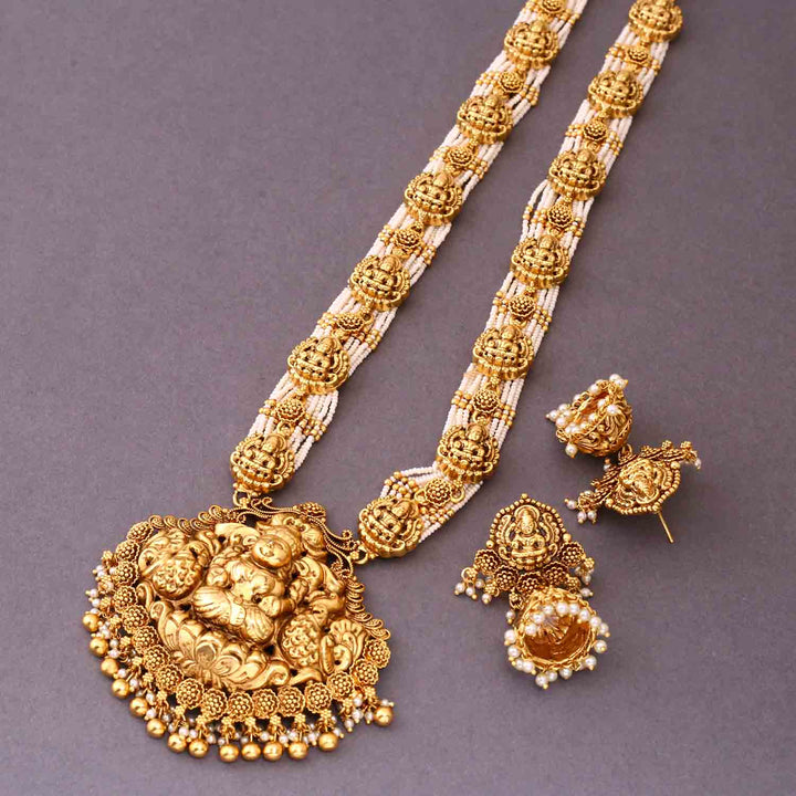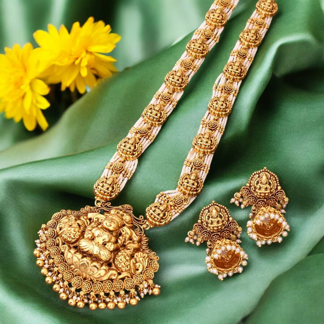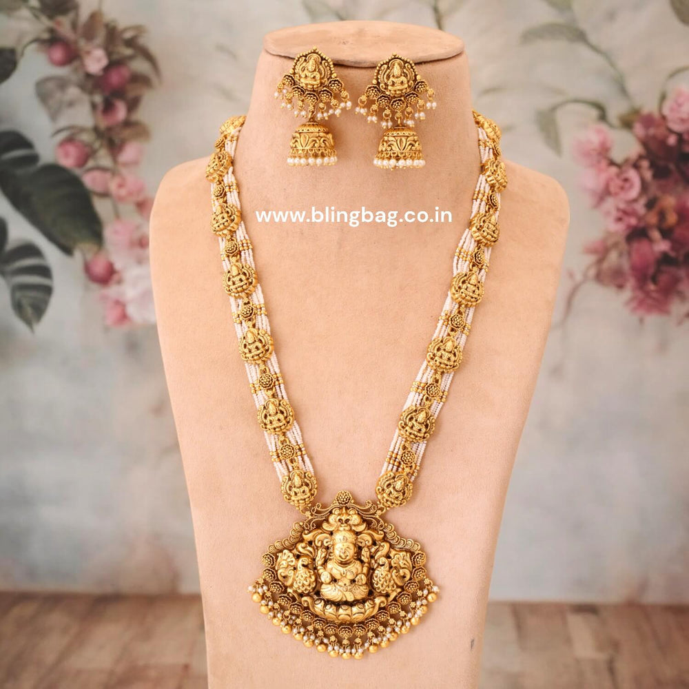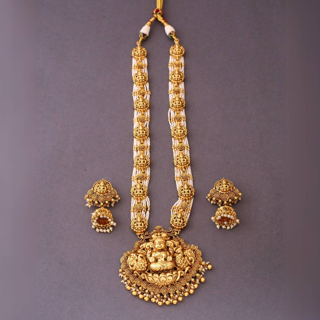 The temple necklace set epitomizes the grandeur and spiritual essence of Indian heritage, blending divine motifs with exquisite craftsmanship. Crafted with precision, each piece in the set showcases a harmonious blend of tradition and elegance.