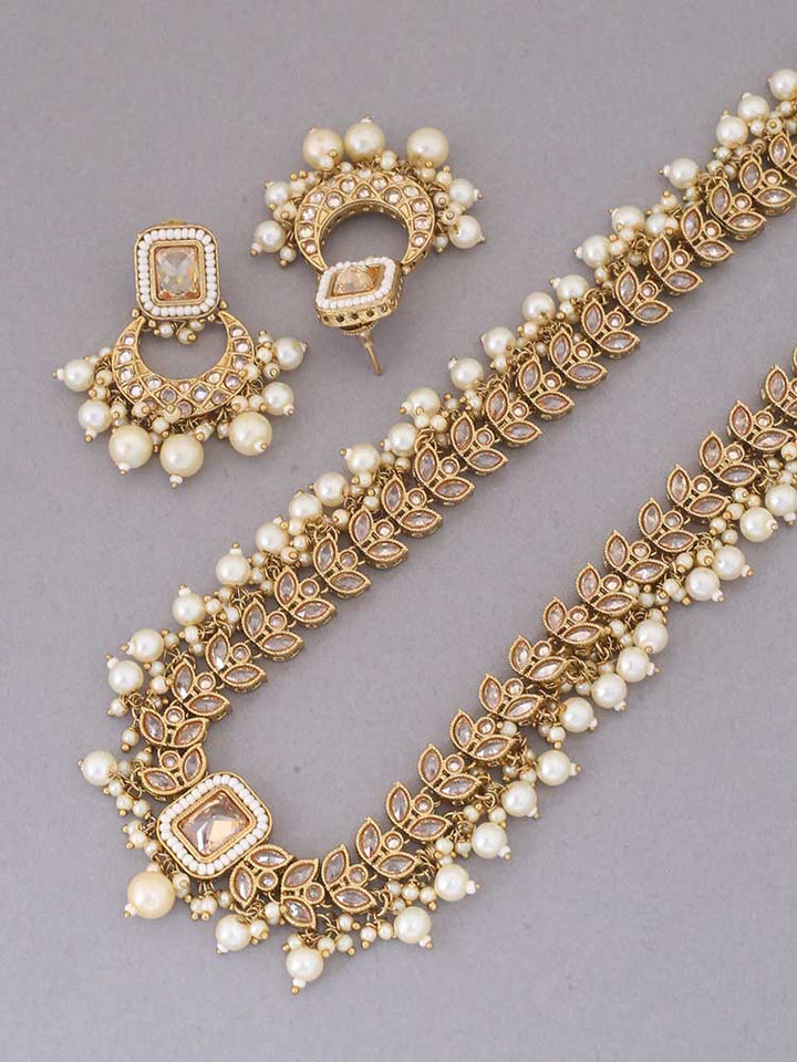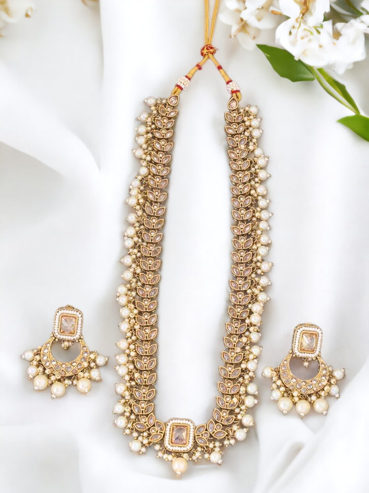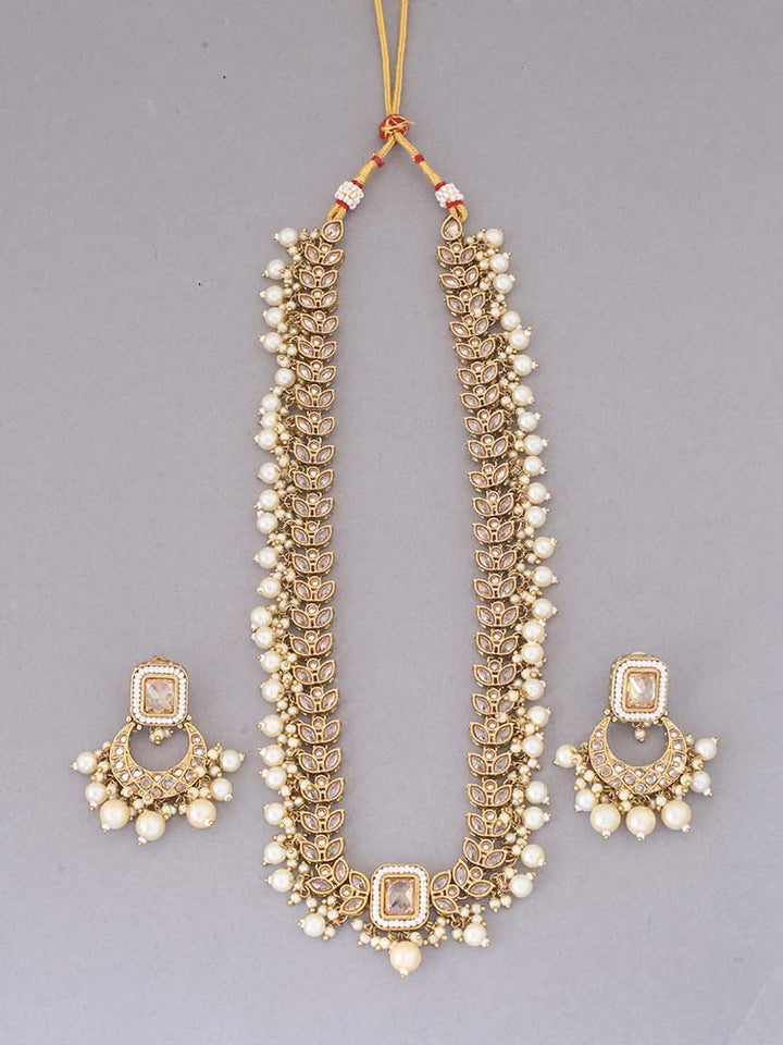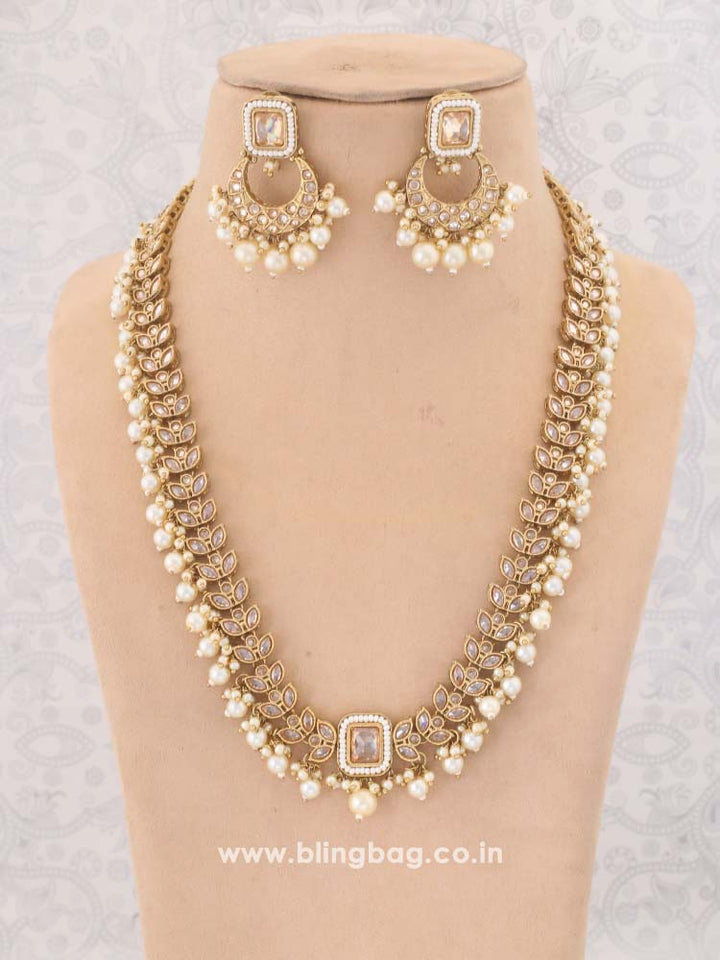 This necklace is the ultimate accessory option for the festive season. This set has a gorgeous circular floral pattern. The necklace has vibrant pearl detailing all over. The set also has a bright element of Kundan detailing in its structure. So, don't miss out on this gorgeous necklace set this eventful season as you have ramps to walk ahead.