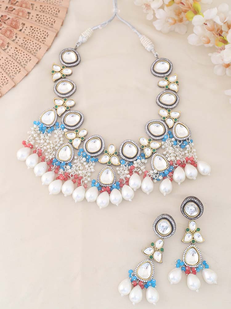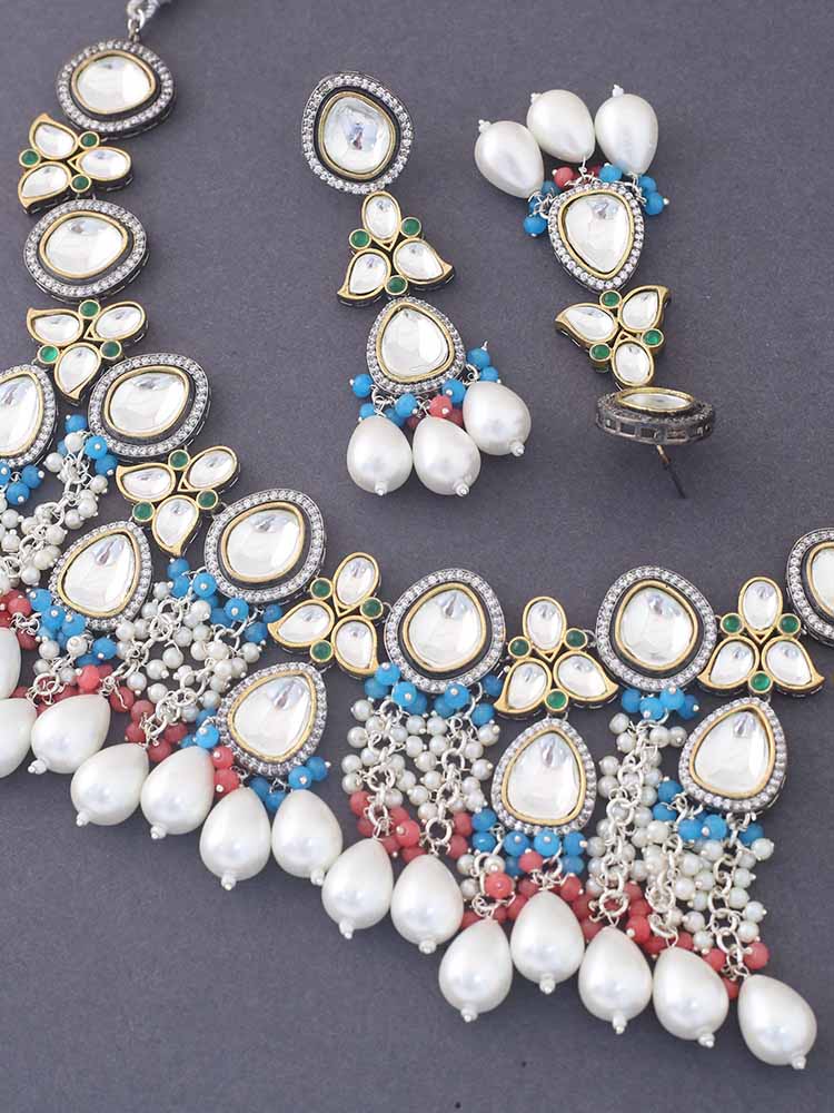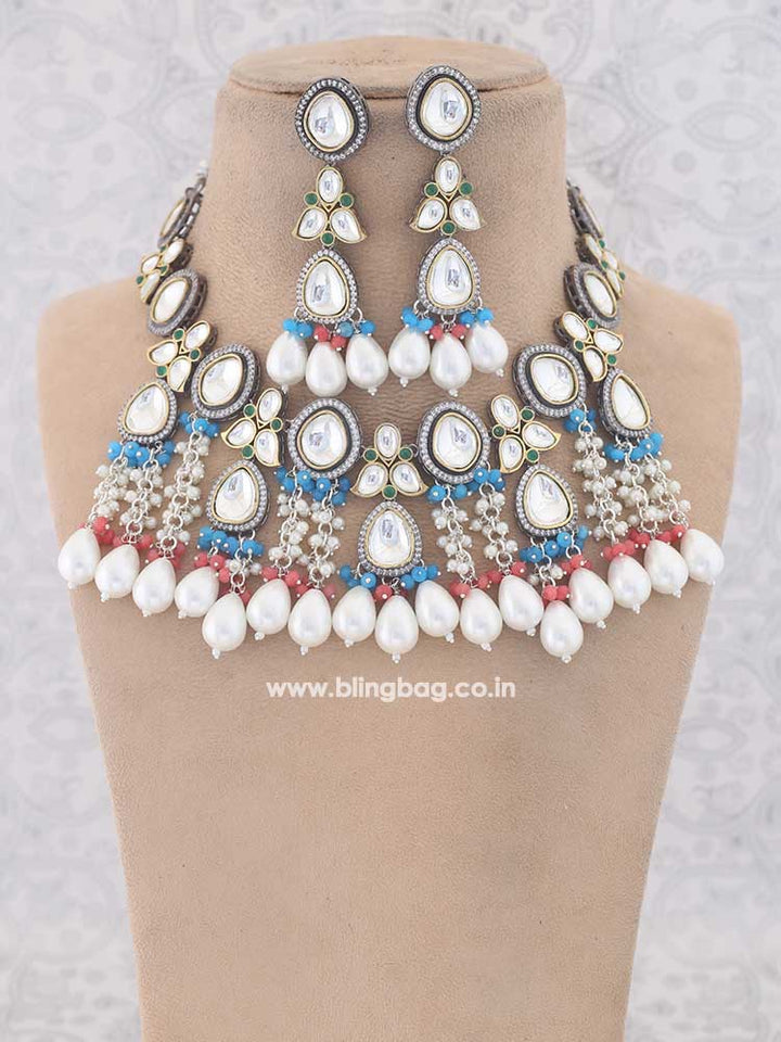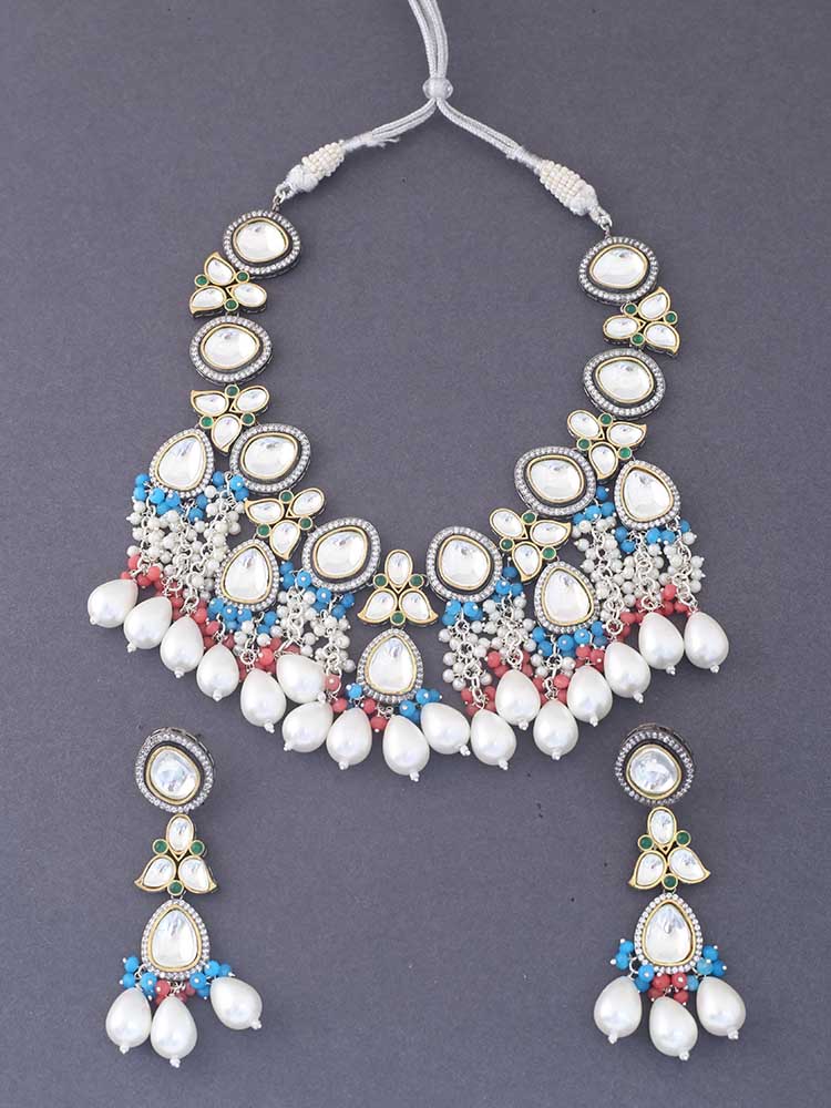 This necklace is the ultimate accessory option for the festive season. This set has a gorgeous circular floral pattern. The necklace has vibrant pearl detailing all over. The set also has a bright element of Kundan detailing in its structure. So, don't miss out on this gorgeous necklace set this eventful season as you have ramps to walk ahead.