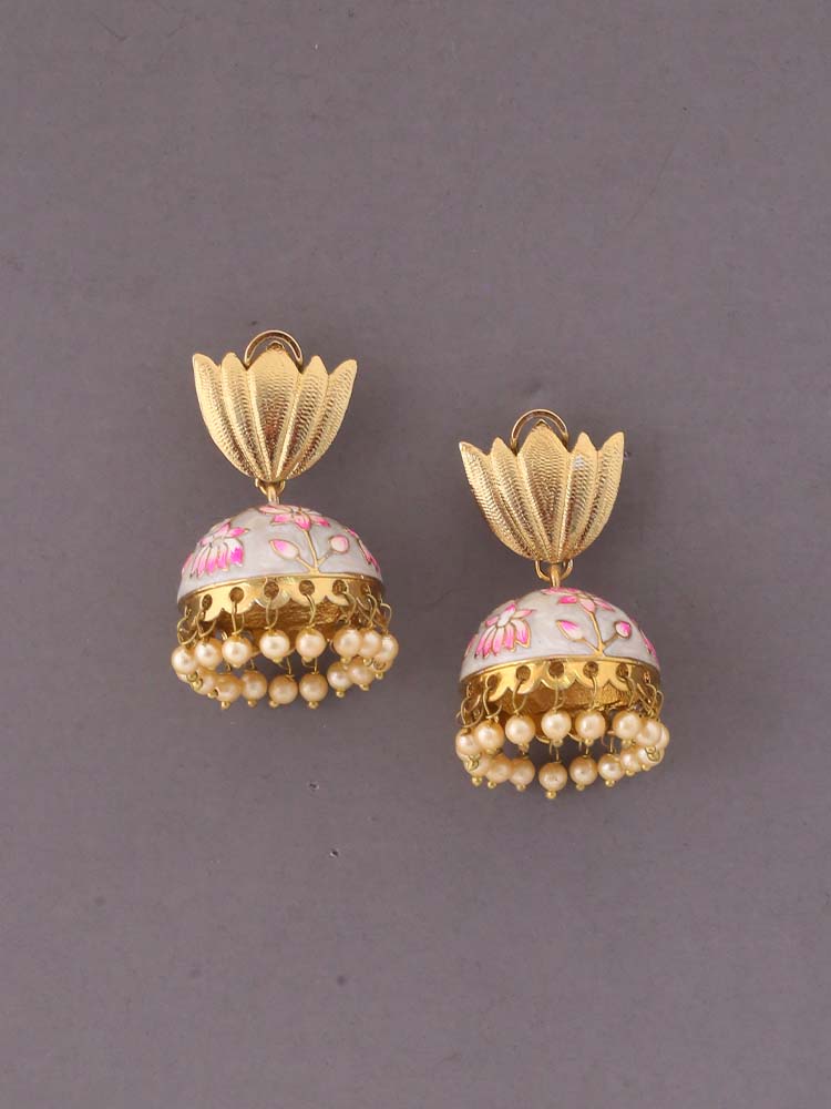 Bringing straight to you the charms of Rajasthan, This pair of eclectic jhumkis have a gorgeous meenakari detailing in all its body. The pair has a beautiful lotus flower motif at its center. The kundan work that surrounds it all over creates an added layer of gorgeousness to this pair. The pair has pearl detail which is equally delicate. These are a breathtaking pair of statement jhumkis. The jhumkis are perfect for the wedding season. These jhumkis can make any outfit shine.