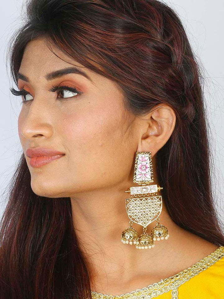 These are an exquisite pair of earrings which have the beautification of an elaborate kundan work. There are an added gorgeous elements of pearls and meenakari motifs in this piece. The piece is further even more beautified by the presence of multiple jhumkis
