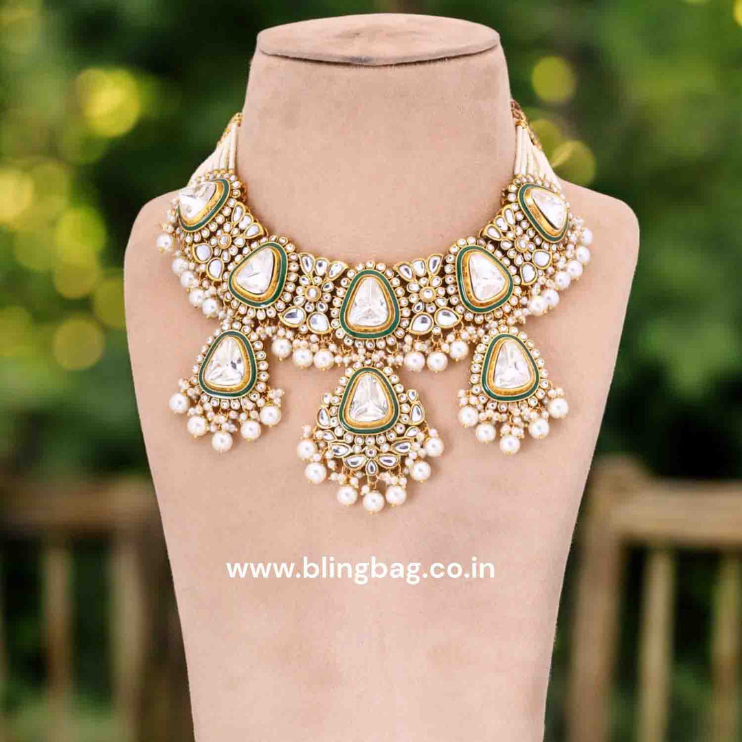 This necklace is the ultimate accessory option for the festive season. This set has a gorgeous circular floral pattern. The necklace has vibrant pearl detailing all over. The set also has a bright element of Kundan detailing in its structure. So, don't miss out on this gorgeous necklace set this eventful season as you have ramps to walk ahead.