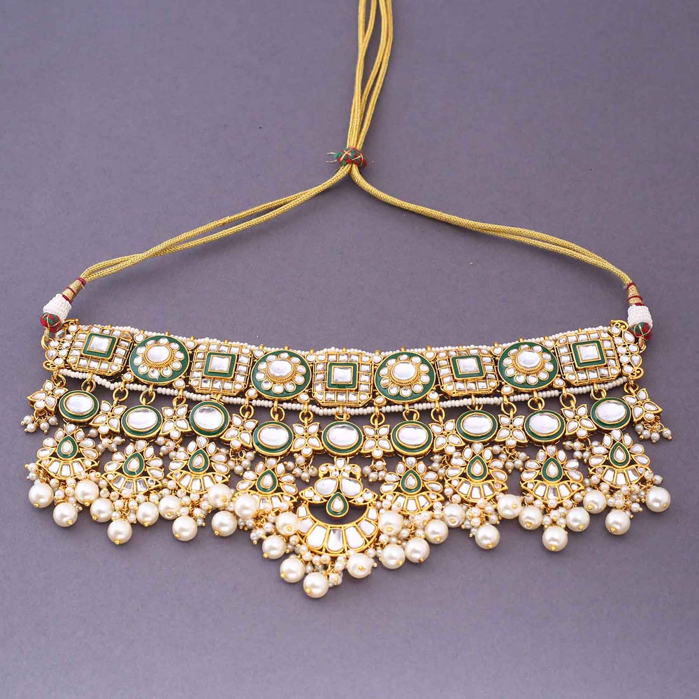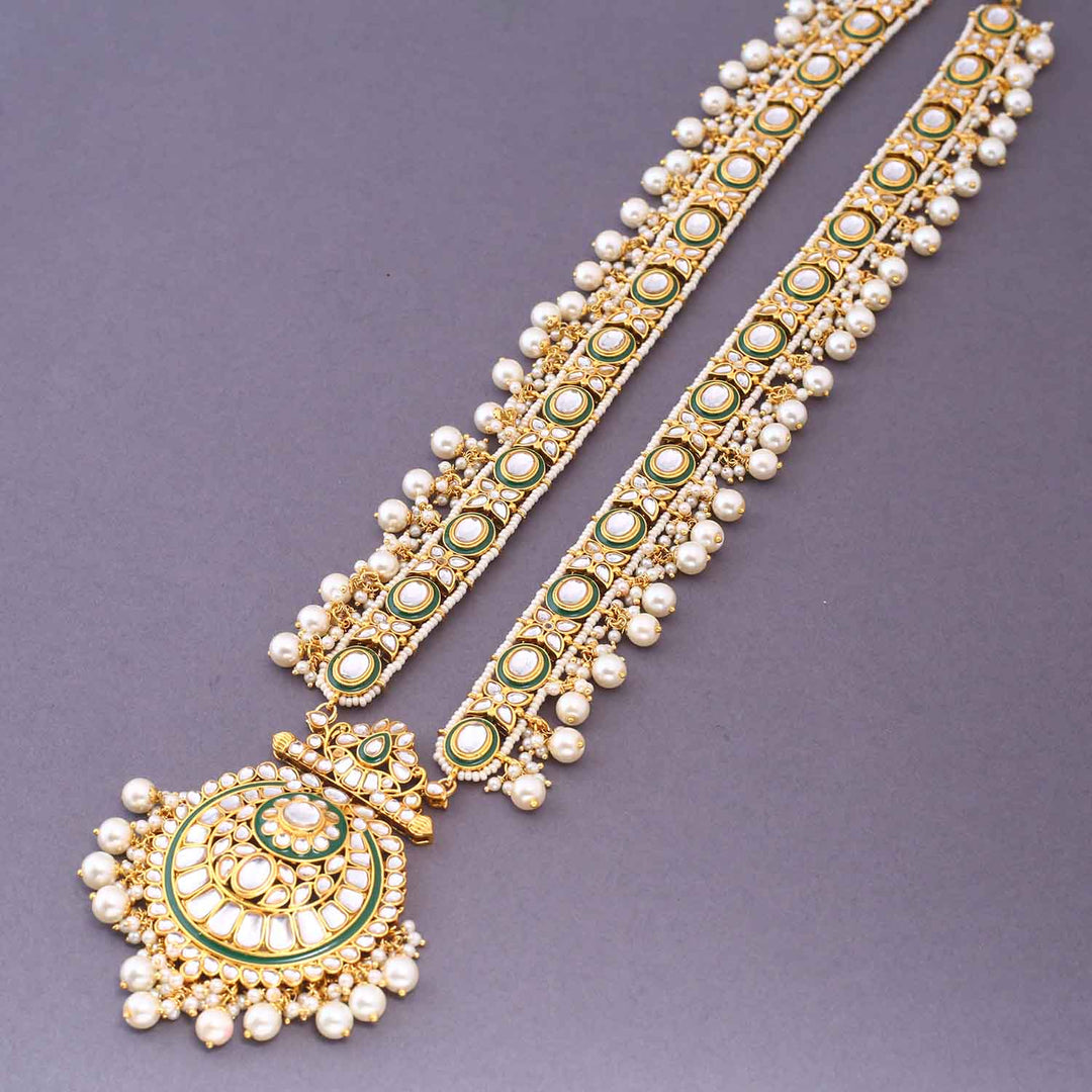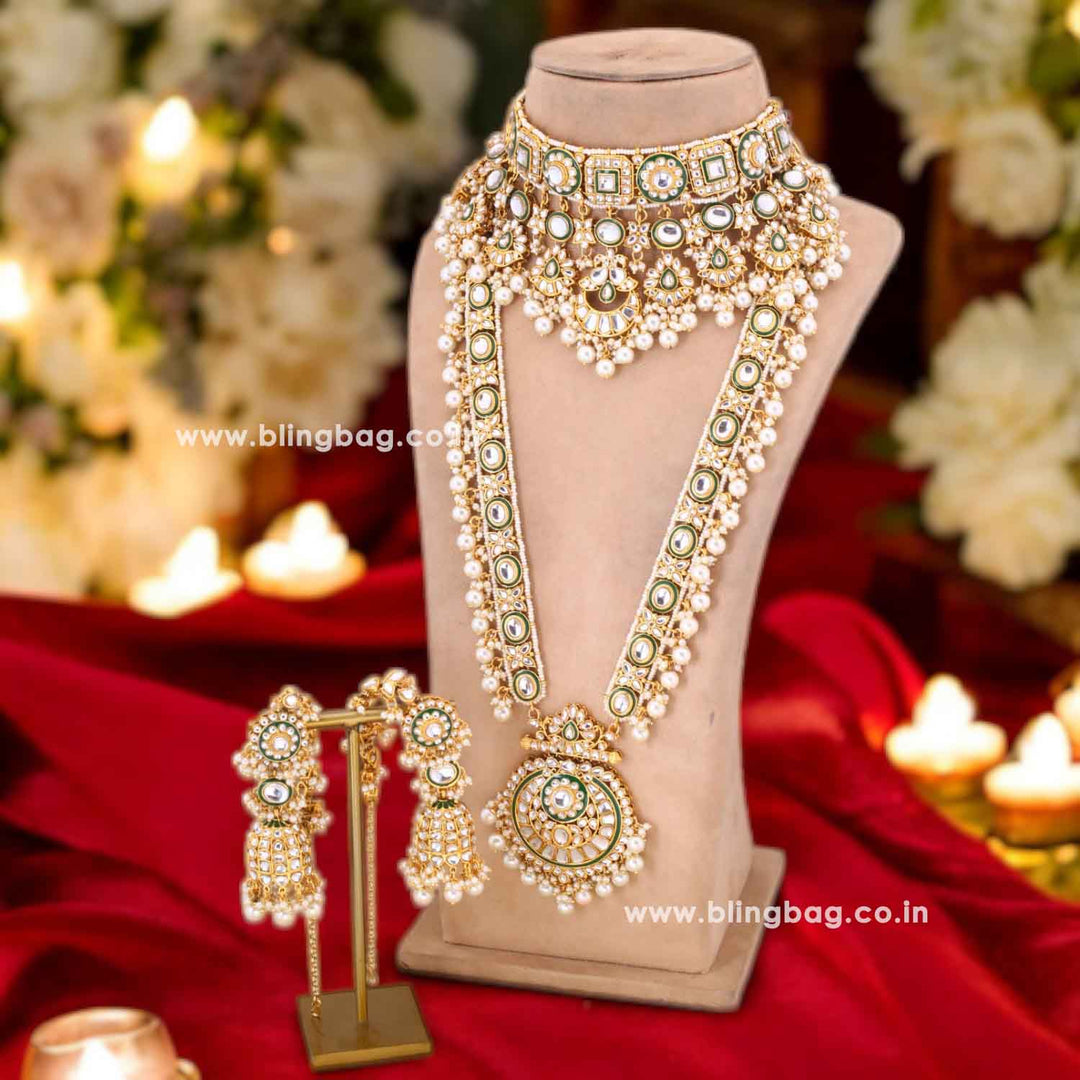 The set includes a stunning necklaces, matching earrings, and a beautiful maang tikka, all meticulously crafted with high-quality Kundan stones and lustrous pearls. The gold-plated finish adds a touch of elegance, making it a perfect complement to any bridal ensemble. With proper care, this jewelry will remain a cherished keepsake for years to come