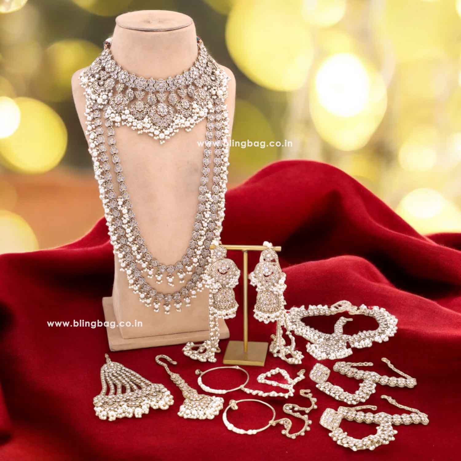 • Unit:Two Necklaces, One Pair Of Earrings, One Maang Tikka, one Pair of Hathphool, One Passa, Two Nath and one Matha Patti.