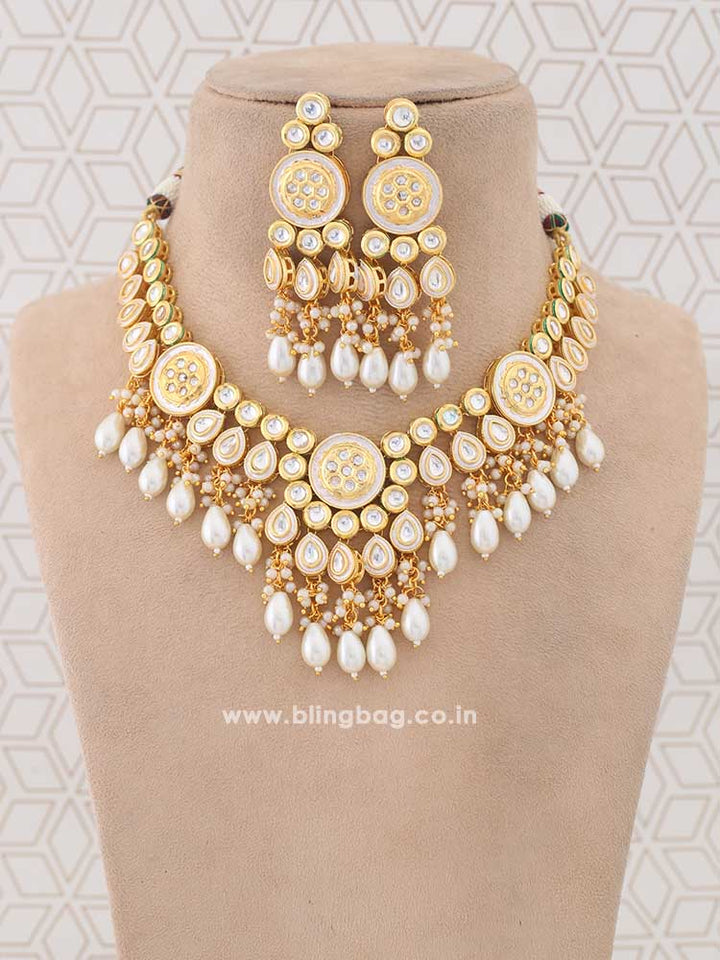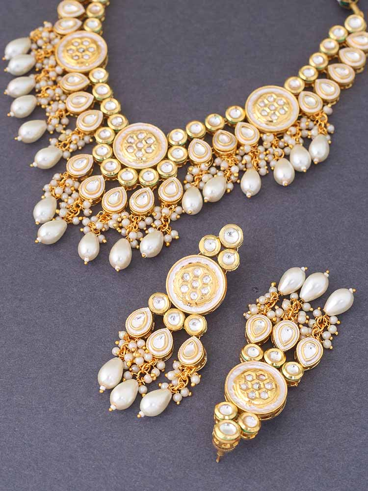 This necklace is the ultimate accessory option for the festive season. This set has a gorgeous circular floral pattern. The necklace has vibrant pearl detailing all over. The set also has a bright element of Kundan detailing in its structure. So, don't miss out on this gorgeous necklace set this eventful season as you have ramps to walk ahead.