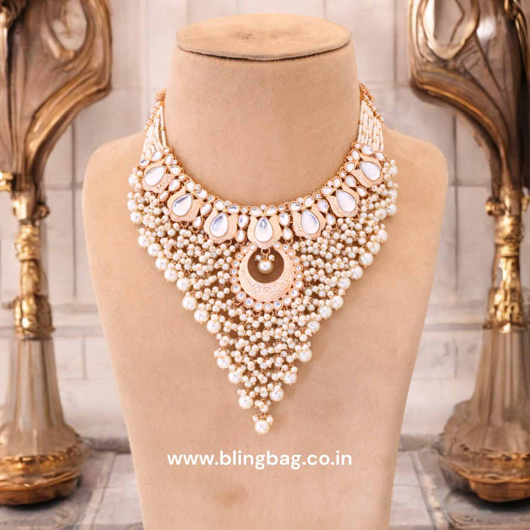 This necklace is the ultimate accessory option for the festive season. This set has a gorgeous circular floral pattern. The necklace has vibrant pearl detailing all over. The set also has a bright element of Kundan detailing in its structure. So, make sure to take advantage of this gorgeous necklace set this eventful season as you have ramps to walk ahead.