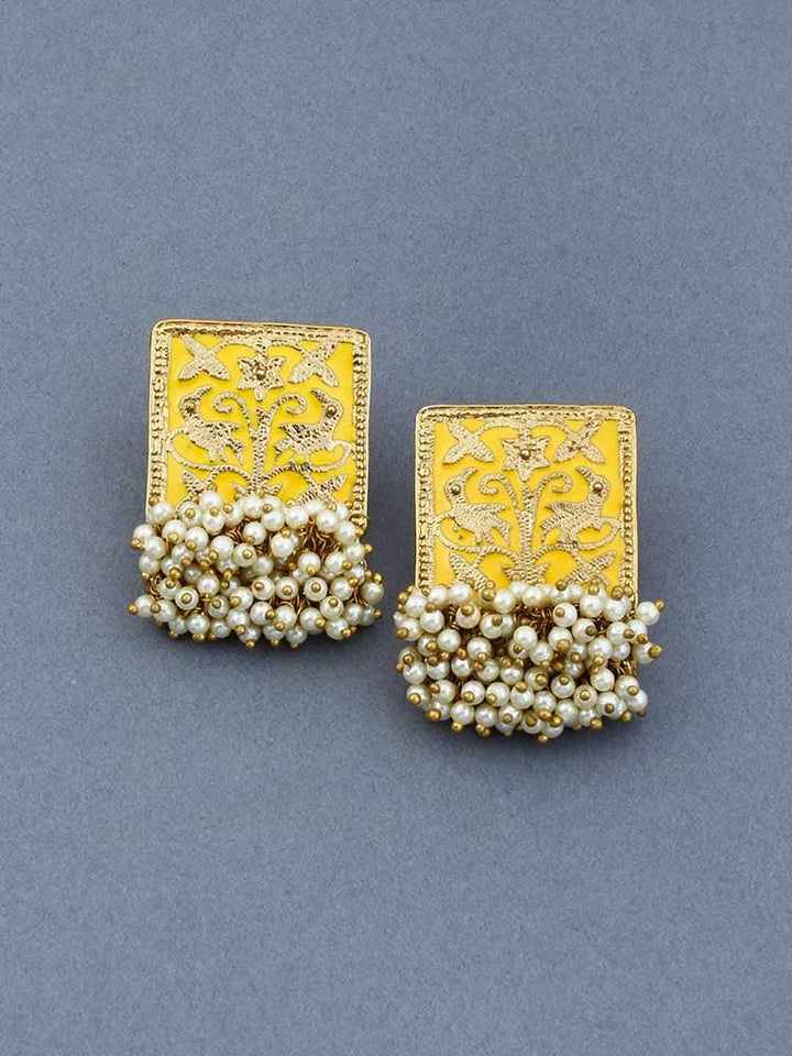 Yellow Gowri Designer Studs are anåÊAlloy ,åÊPearls based studs. They are very intricate in detailing. The pair have a beautiful ethnic design and are so versatile that they can be worn with almost any ethnic outfit.åÊ