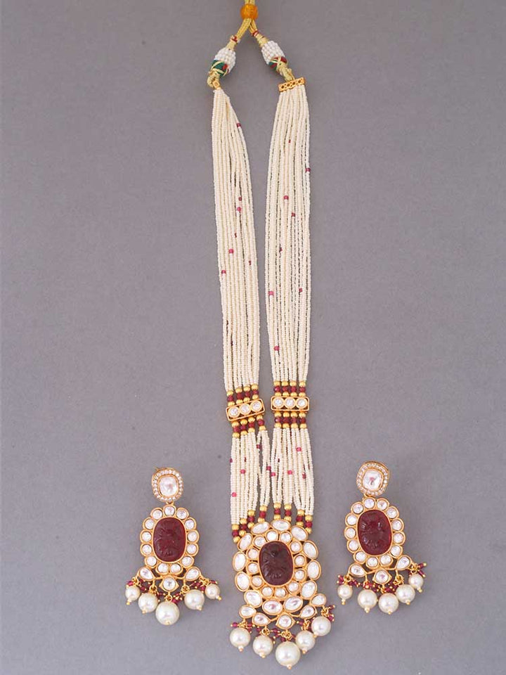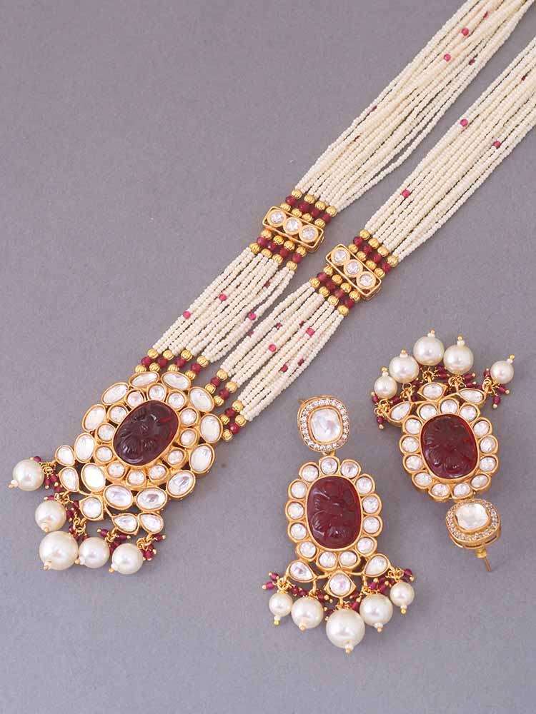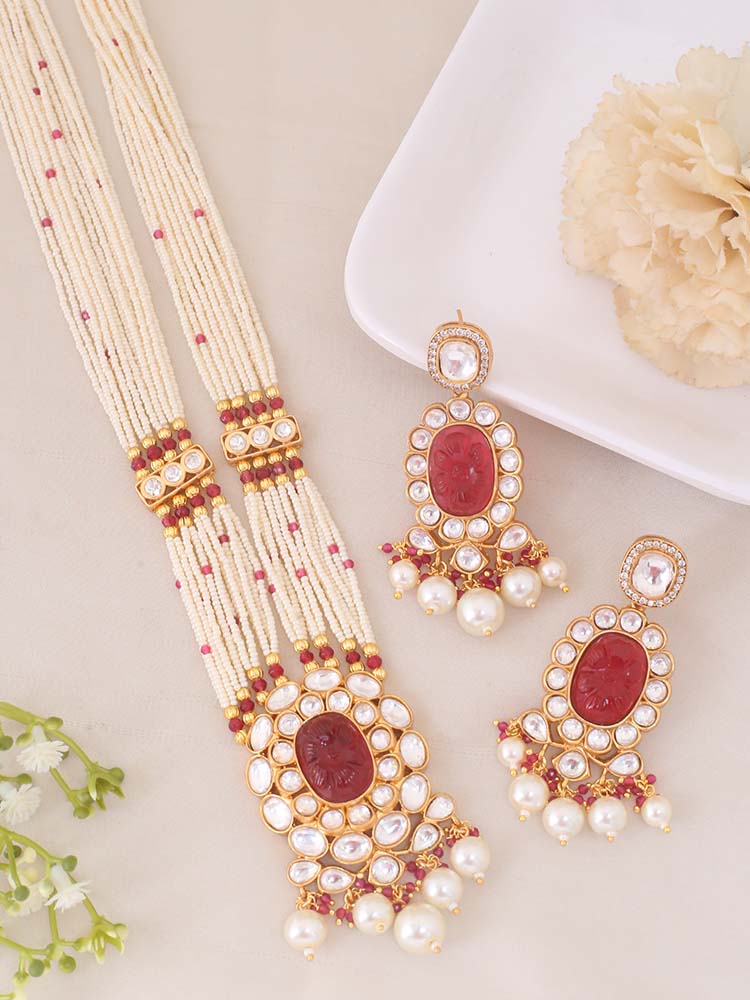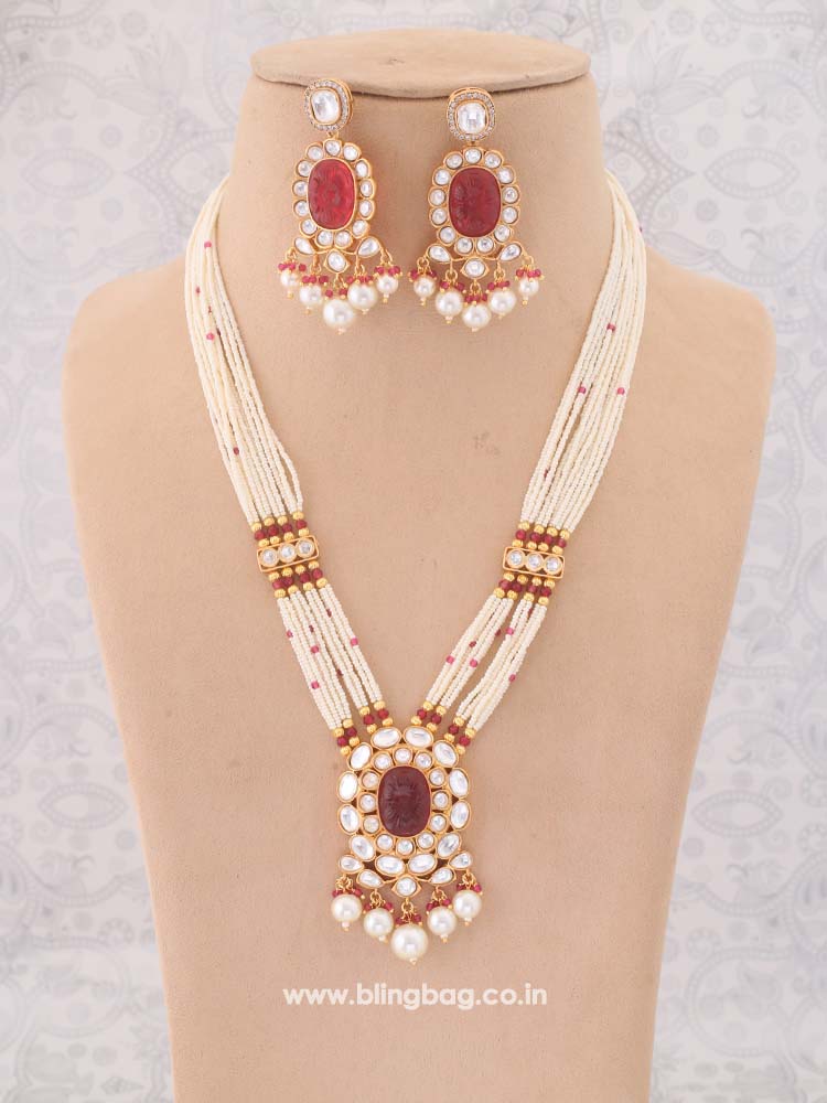 This necklace is the ultimate accessory option for the festive season. This set has a gorgeous circular floral pattern. The necklace has vibrant pearl detailing all over. The set also has a bright element of Kundan detailing in its structure. So, don't miss out on this gorgeous necklace set this eventful season as you have ramps to walk ahead.