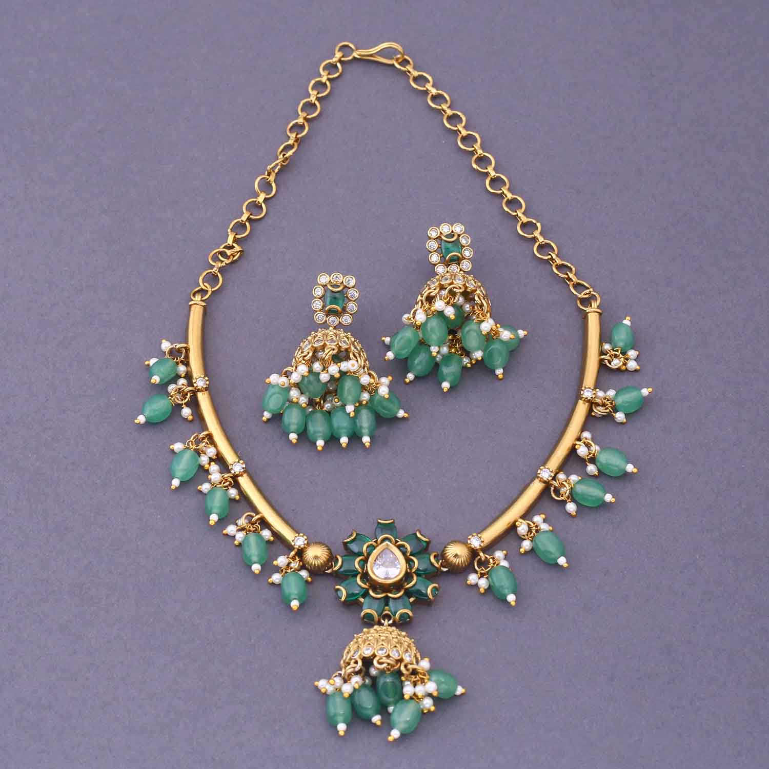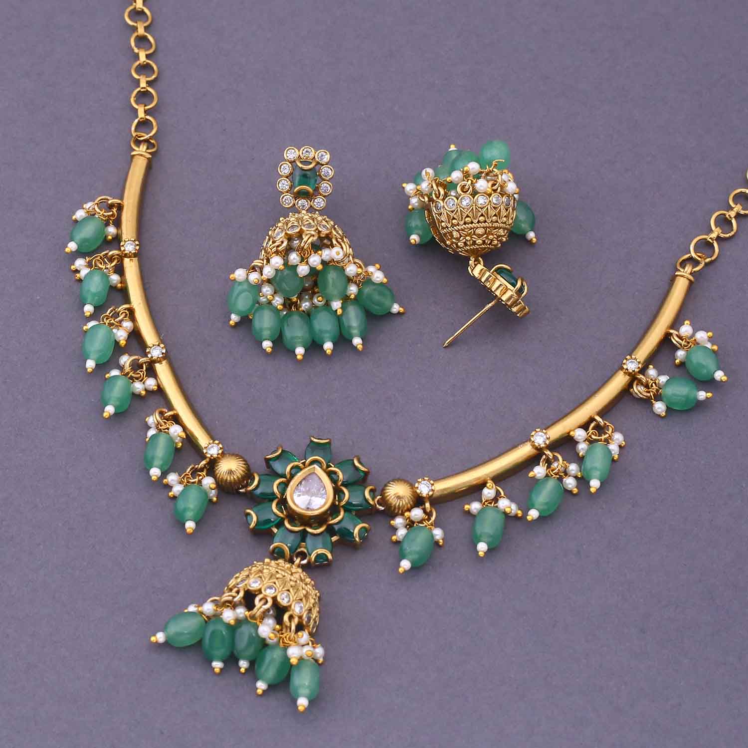 Discover glamour with the new Mint Kurmi Hasli Antique Jewellery Set . it's a timeless and elegant addition to any wardrobe. Elevate your style with this luxurious and exclusive set.