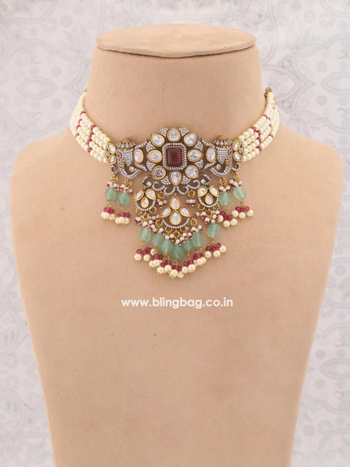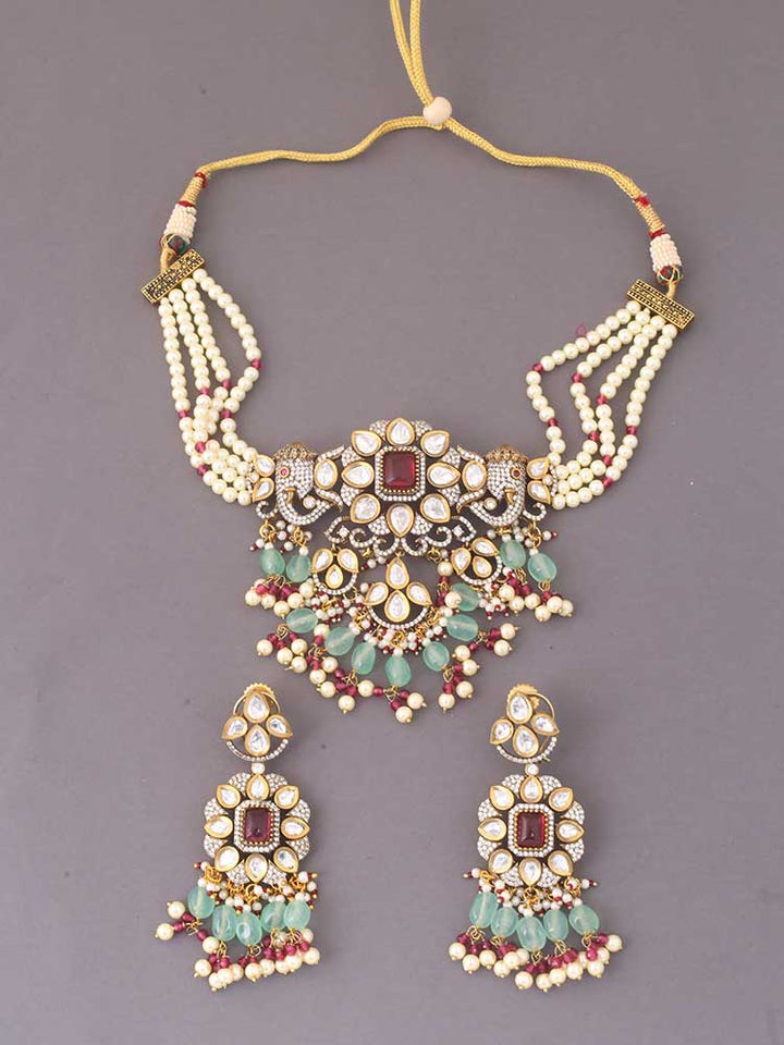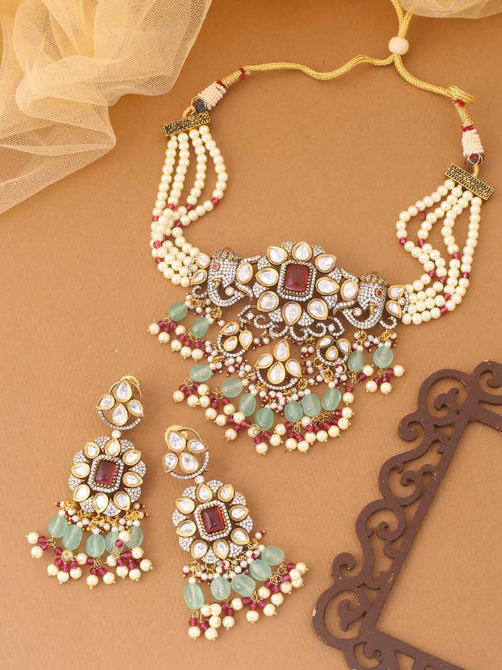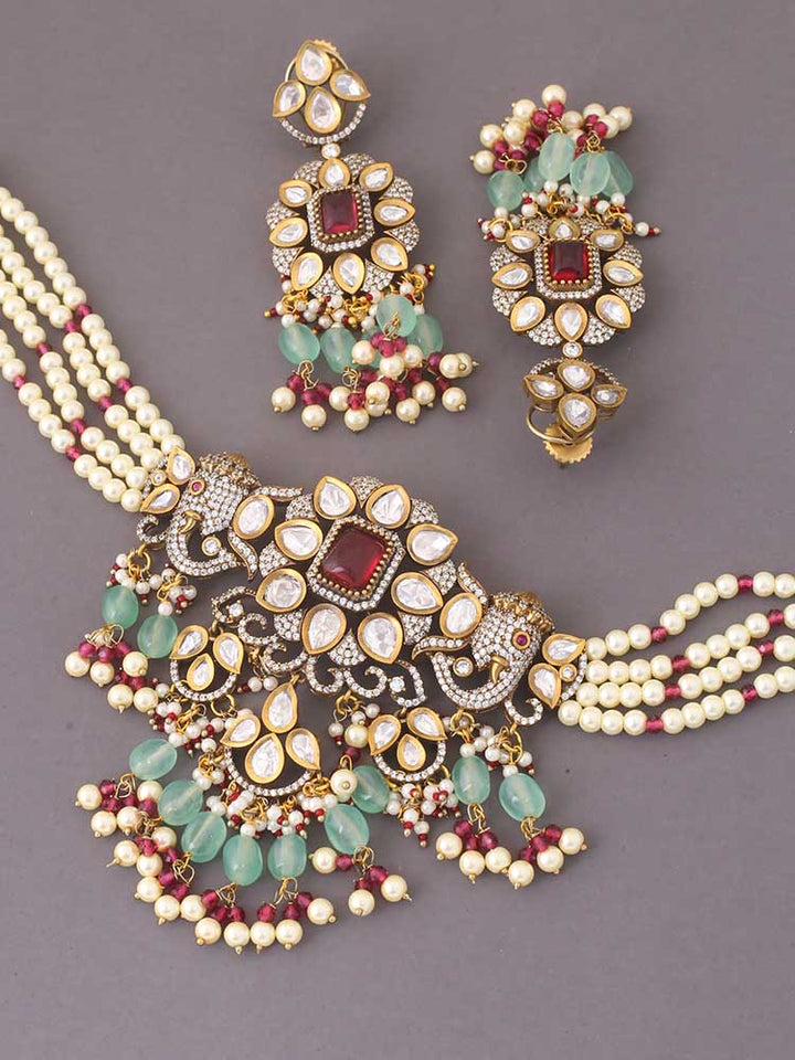 This necklace is the ultimate accessory option for the festive season. This set has a gorgeous circular floral pattern. The necklace has vibrant pearl detailing all over. The set also has a bright element of Kundan detailing in its structure. So, don't miss out on this gorgeous necklace set this eventful season as you have ramps to walk ahead.