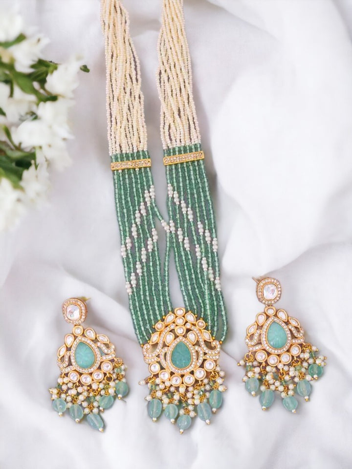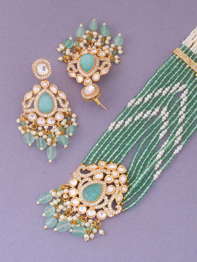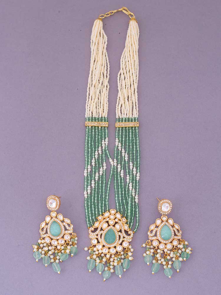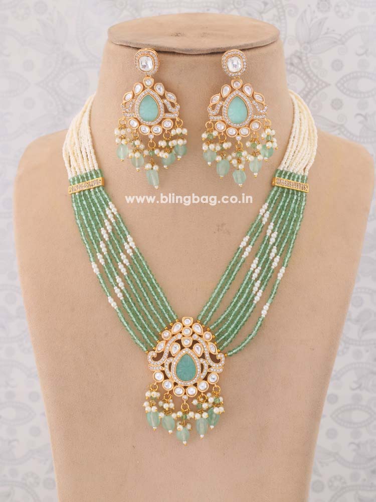 This necklace is the ultimate accessory option for the festive season. This set has a gorgeous circular floral pattern. The necklace has vibrant pearl detailing all over. The set also has a bright element of Kundan detailing in its structure. So, don't miss out on this gorgeous necklace set this eventful season as you have ramps to walk ahead.