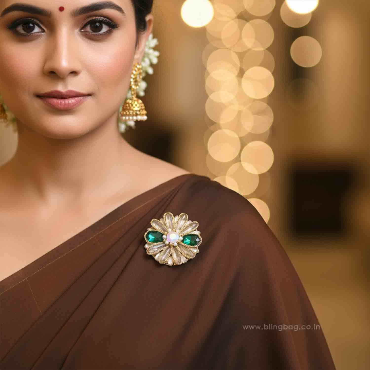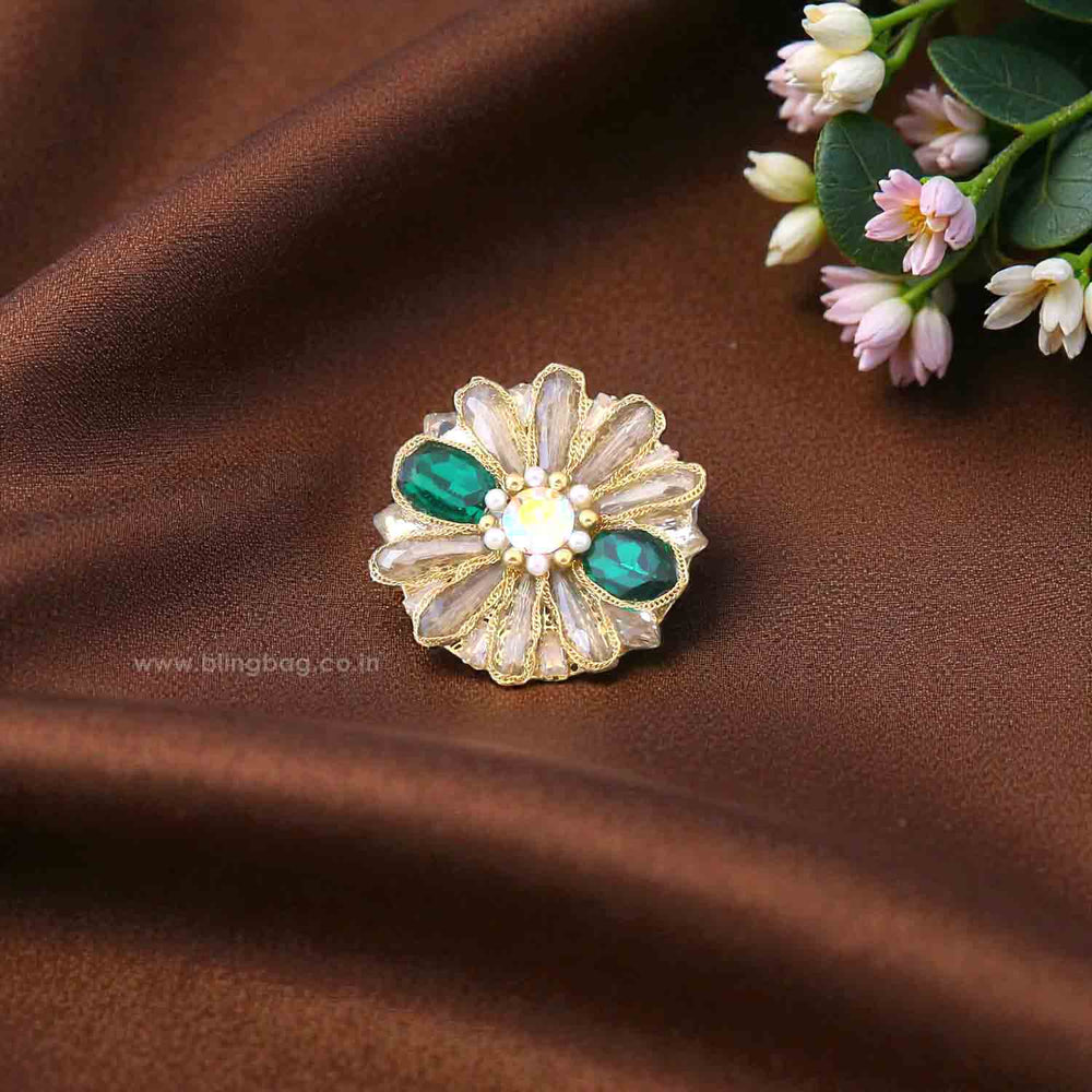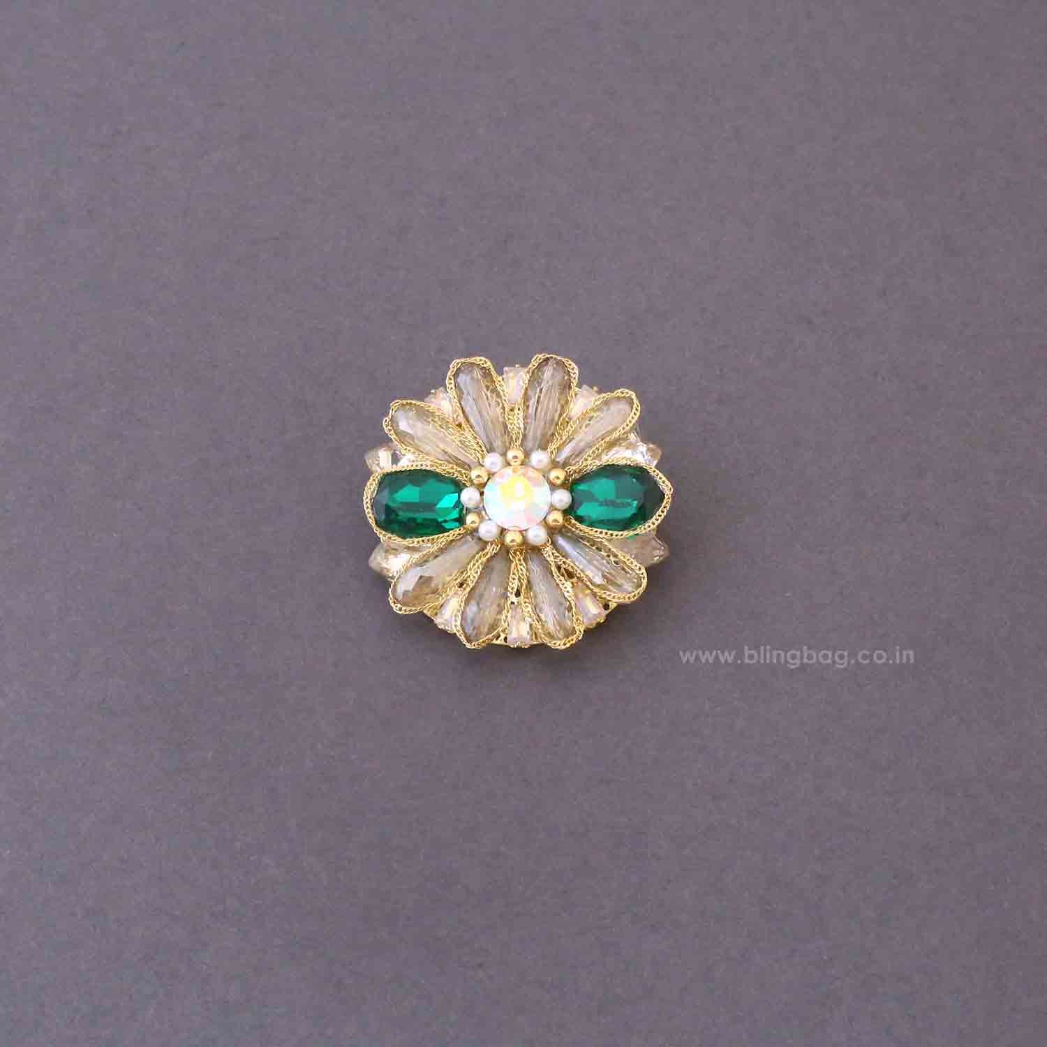 This elegant floral-inspired accessory features a detailed petal design highlighted with sparkling accents and a soft center detail. The balanced arrangement and refined craftsmanship give it a graceful look, making it suitable for festive and special occasions.