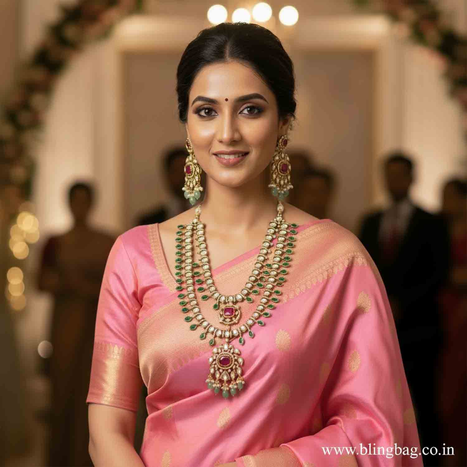 The layered strands and intricate pendant detailing create a grand, royal statement perfect for weddings and festive occasions.