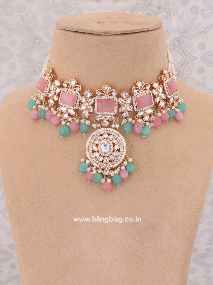 This necklace is the ultimate accessory option for the festive season. This set has a gorgeous circular floral pattern. The necklace has vibrant pearl detailing all over. The set also has a bright element of Kundan detailing in its structure. So, don't miss out on this gorgeous necklace set this eventful season as you have ramps to walk ahead.