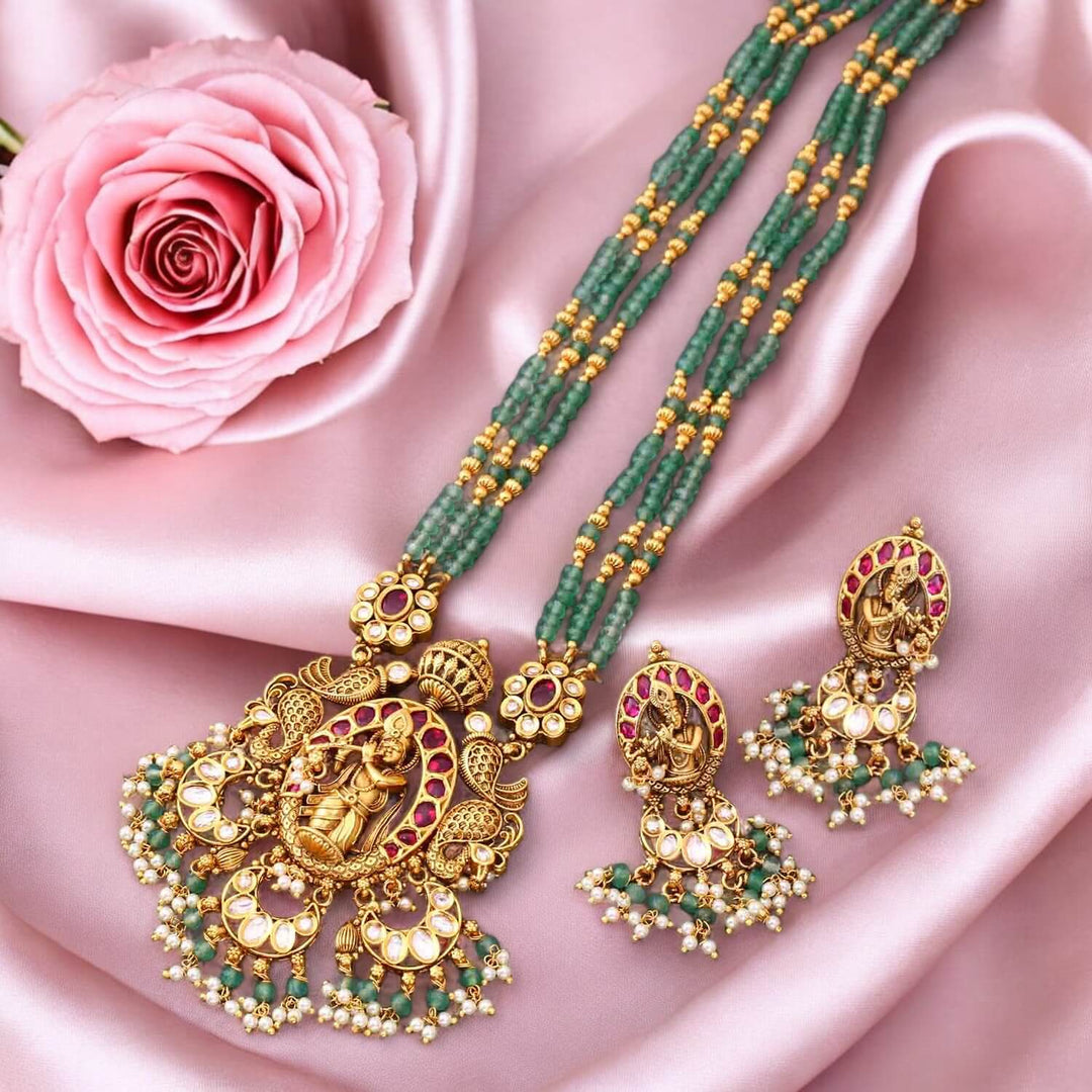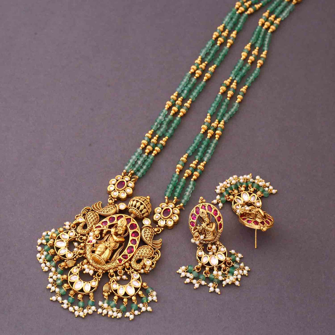 The temple necklace set epitomizes the grandeur and spiritual essence of Indian heritage, blending divine motifs with exquisite craftsmanship. Crafted with precision, each piece in the set showcases a harmonious blend of tradition and elegance.