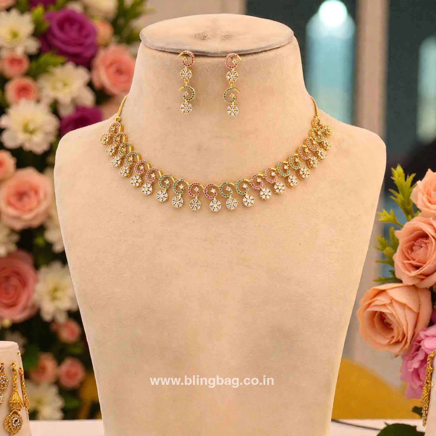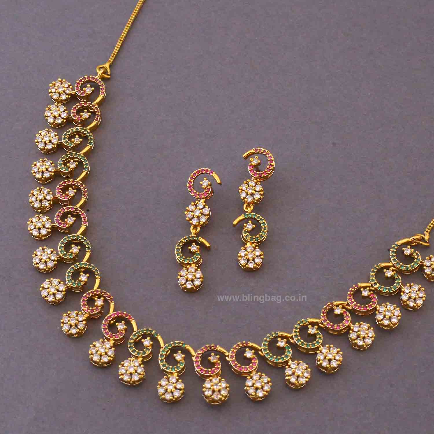 This graceful antique-style necklace set features multicolor swirl detailing with sparkling stone drops in a warm gold finish. The matching earrings add a delicate charm, making it perfect for festive elegance.