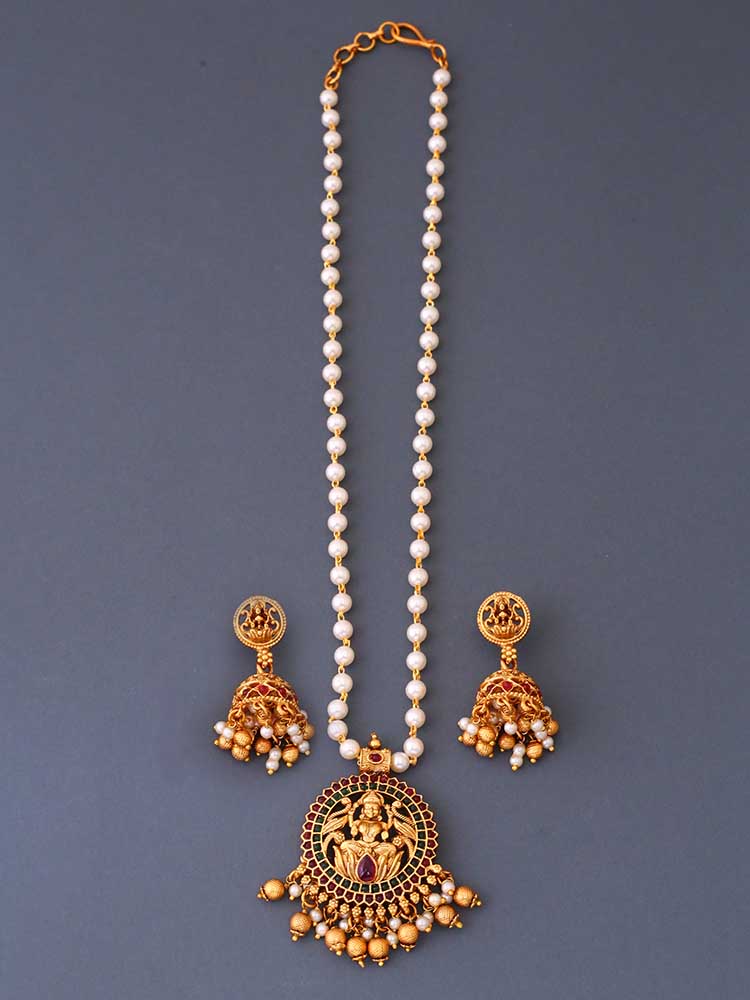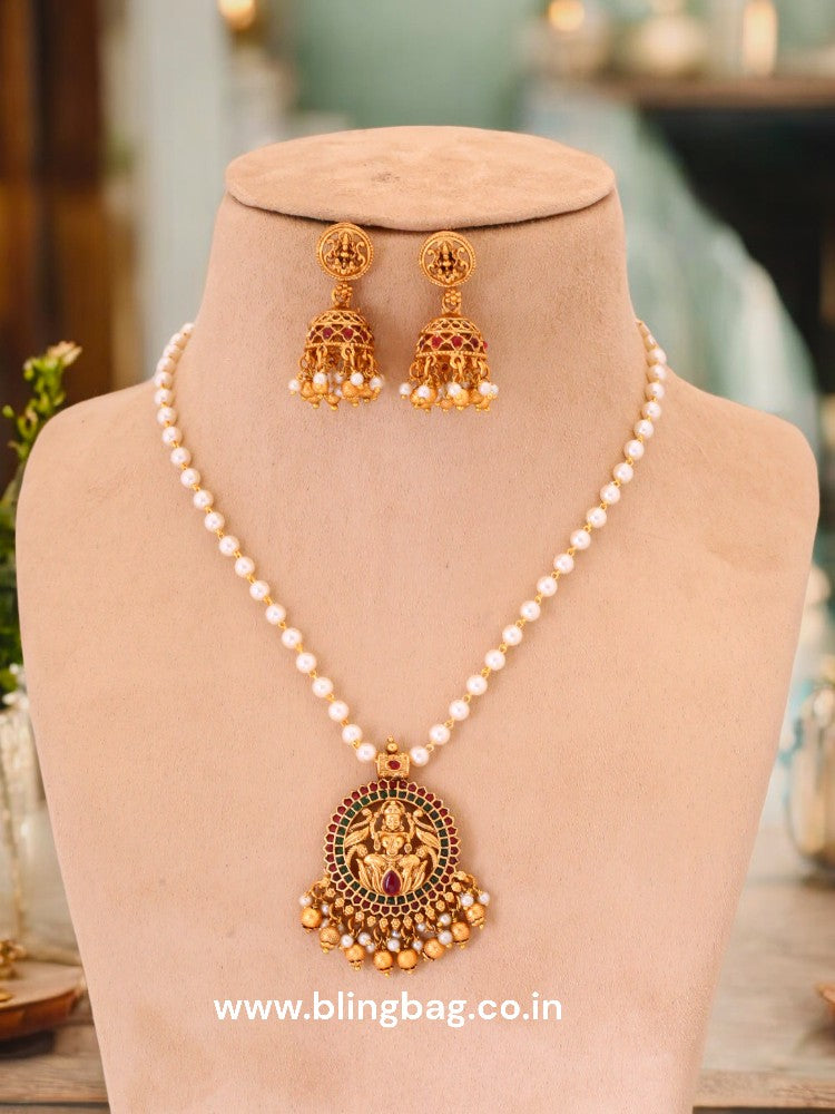 The temple necklace set epitomizes the grandeur and spiritual essence of Indian heritage, blending divine motifs with exquisite craftsmanship. Crafted with precision, each piece in the set showcases a harmonious blend of tradition and elegance.