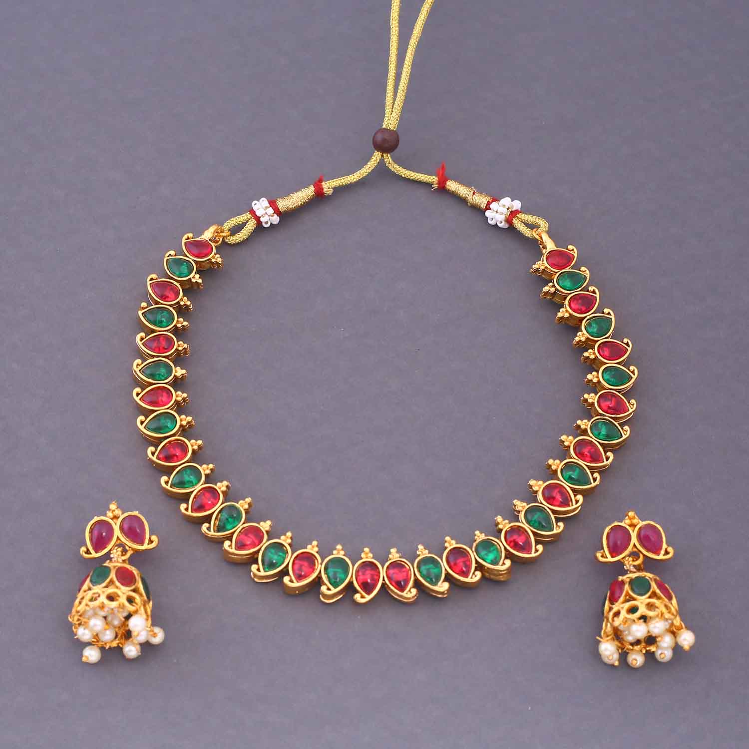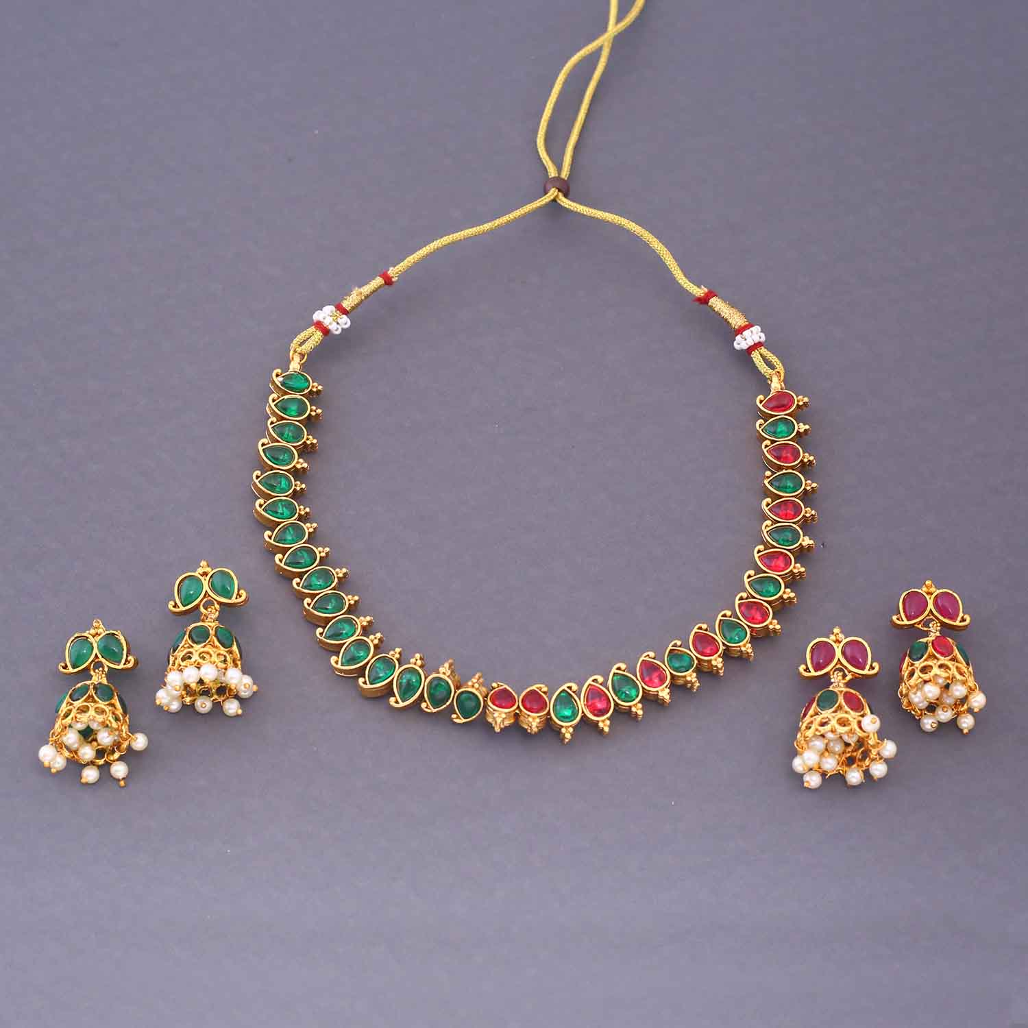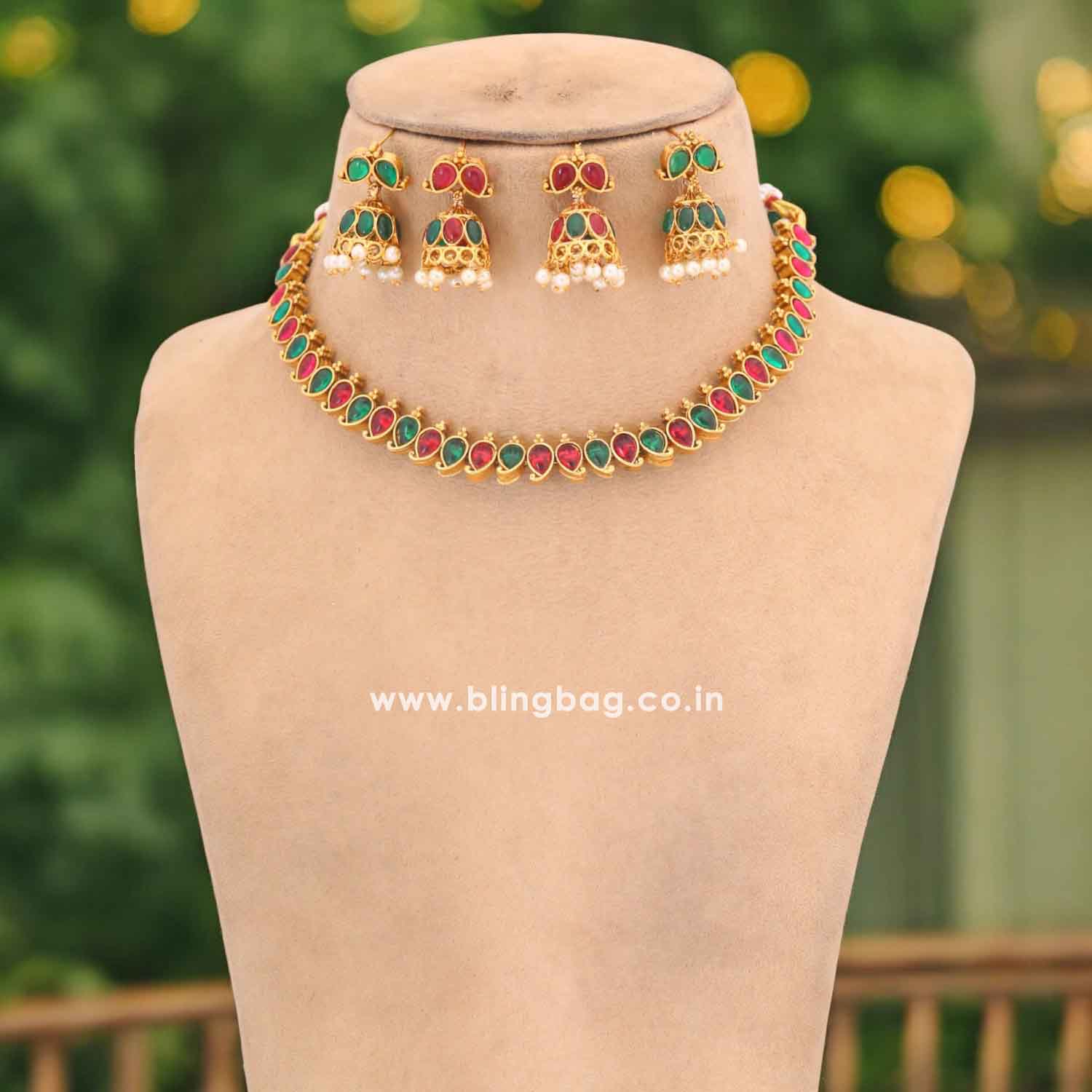 Discover glamour with the new Multicolor Kumuda Antique Jewellery Set. it's a timeless and elegant addition to any wardrobe. Elevate your style with this luxurious and exclusive set.