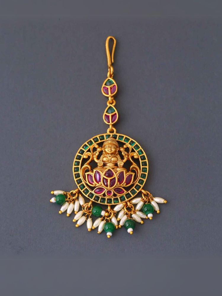 Temple maang tikka, adorned with intricate motifs, adds regal charm to any bridal ensemble.