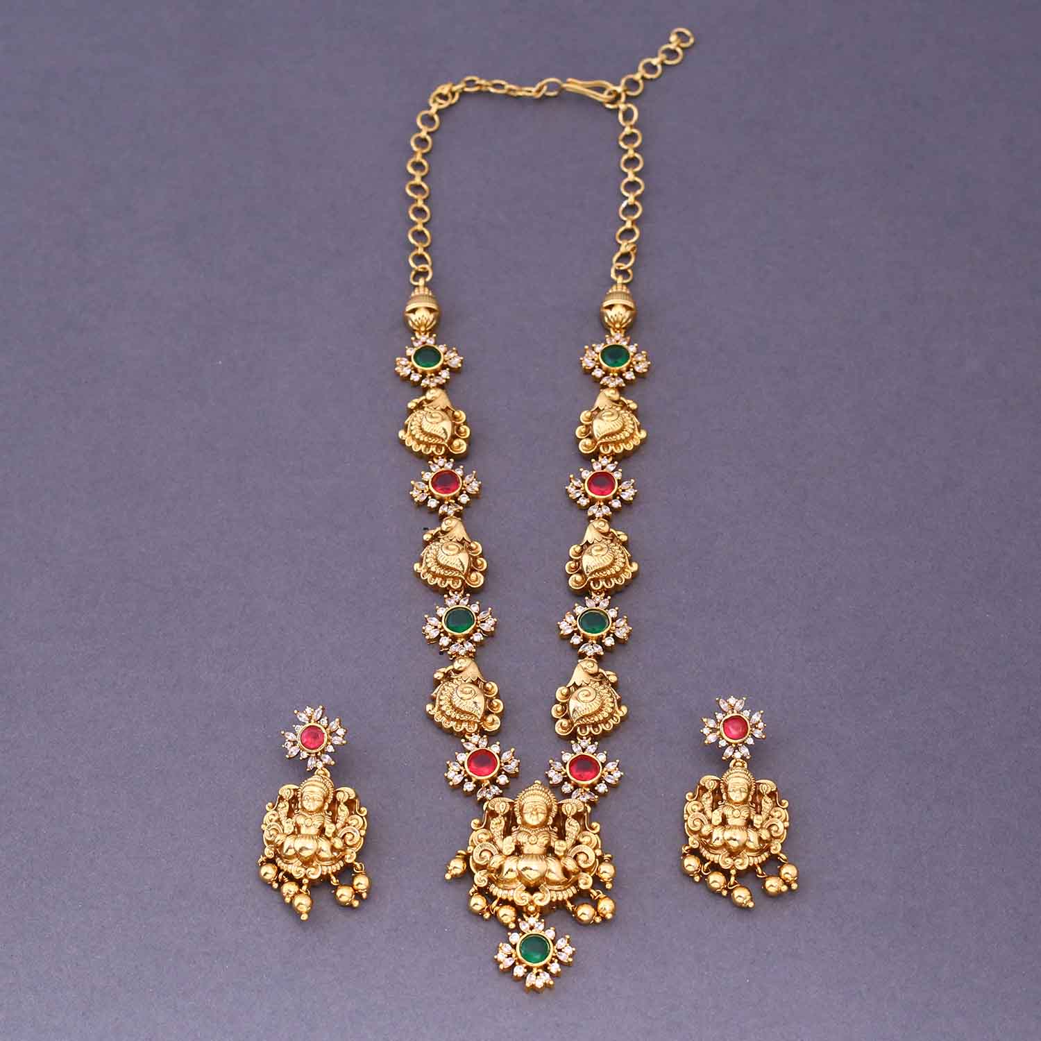 The temple necklace set epitomizes the grandeur and spiritual essence of Indian heritage, blending divine motifs with exquisite craftsmanship. Crafted with precision, each piece in the set showcases a harmonious blend of tradition and elegance.