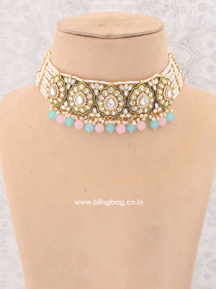 This necklace is the ultimate accessory option for the festive season. This set has a gorgeous circular floral pattern. The necklace has vibrant pearl detailing all over. The set also has a bright element of Kundan detailing in its structure. So, don't miss out on this gorgeous necklace set this eventful season as you have ramps to walk ahead.