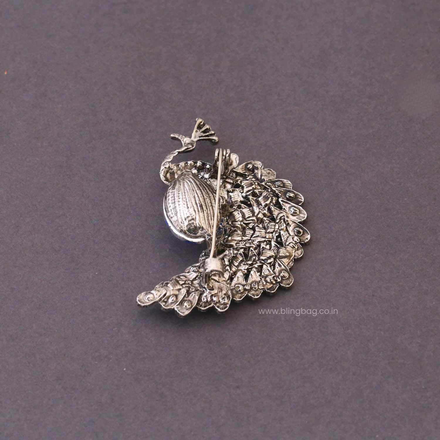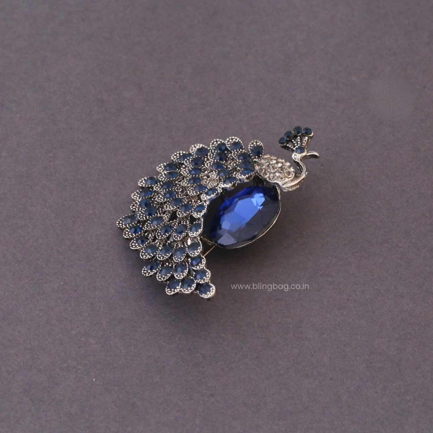 Inspired by the grace of a peacock, this brooch features deep blue stones arranged in an elegant feathered silhouette. The bold centerpiece adds depth and drama, making it a statement accessory for festive and occasion wear.