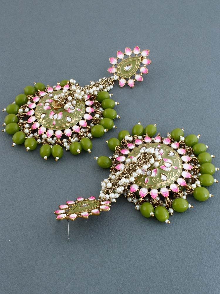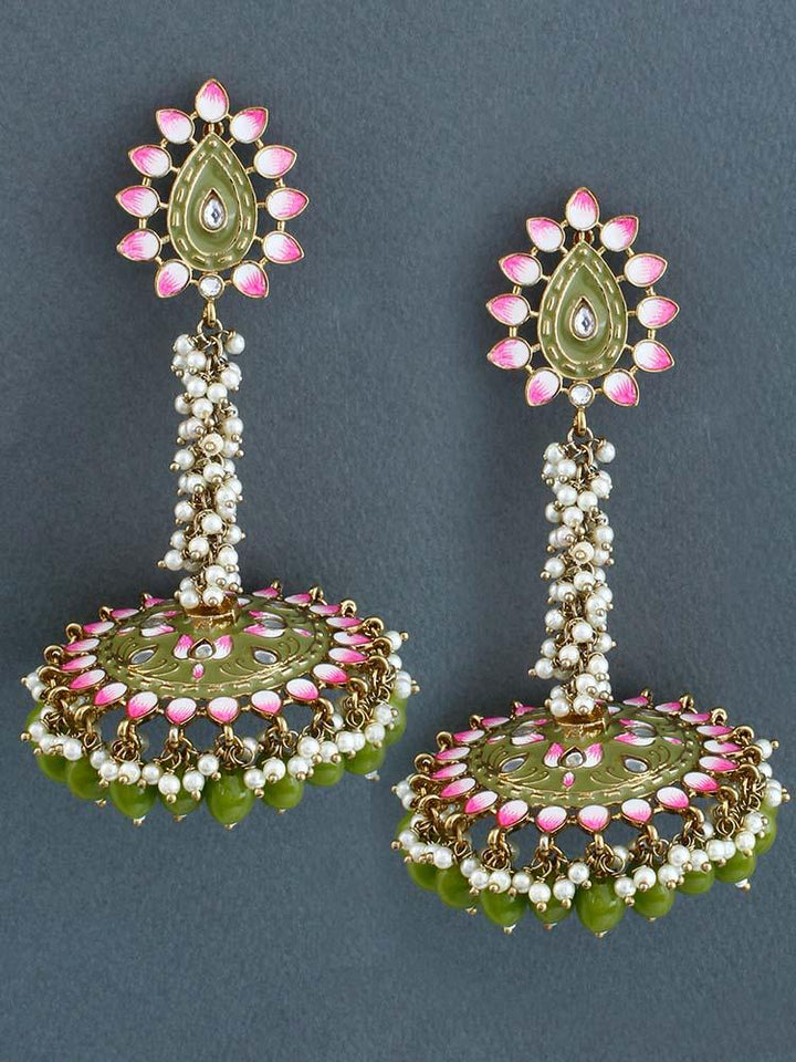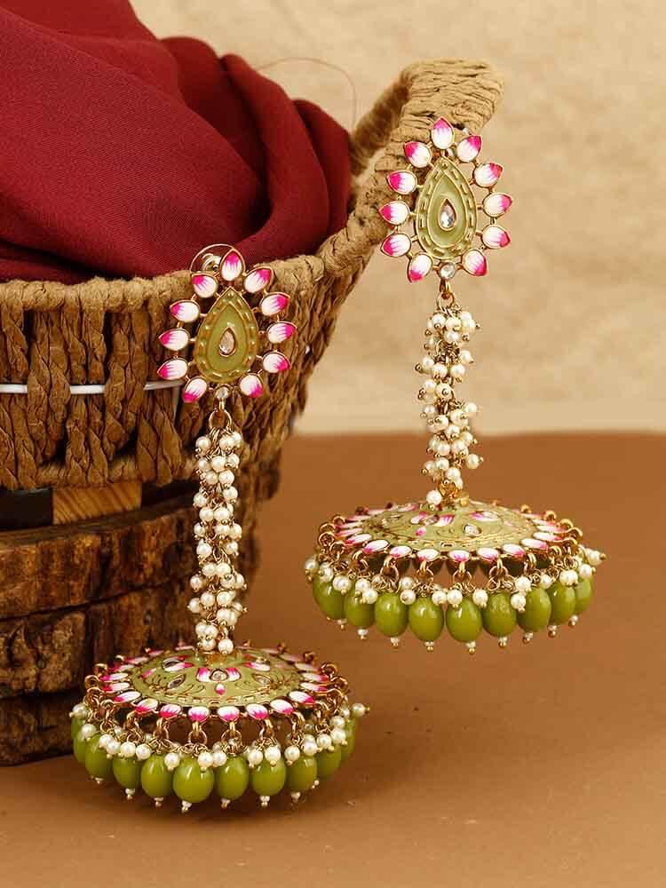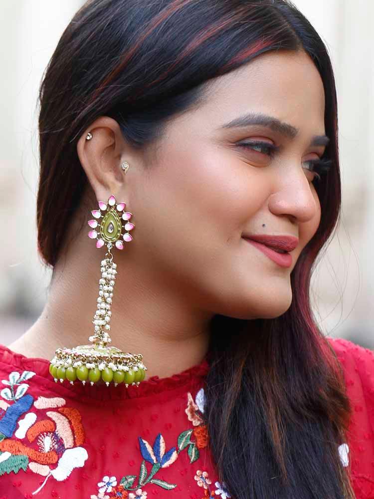 Traditional jhumki earrings with a priceless charm and unique embellishment of kundans, beads and pearls! Just the right choice for every traditional outfit!