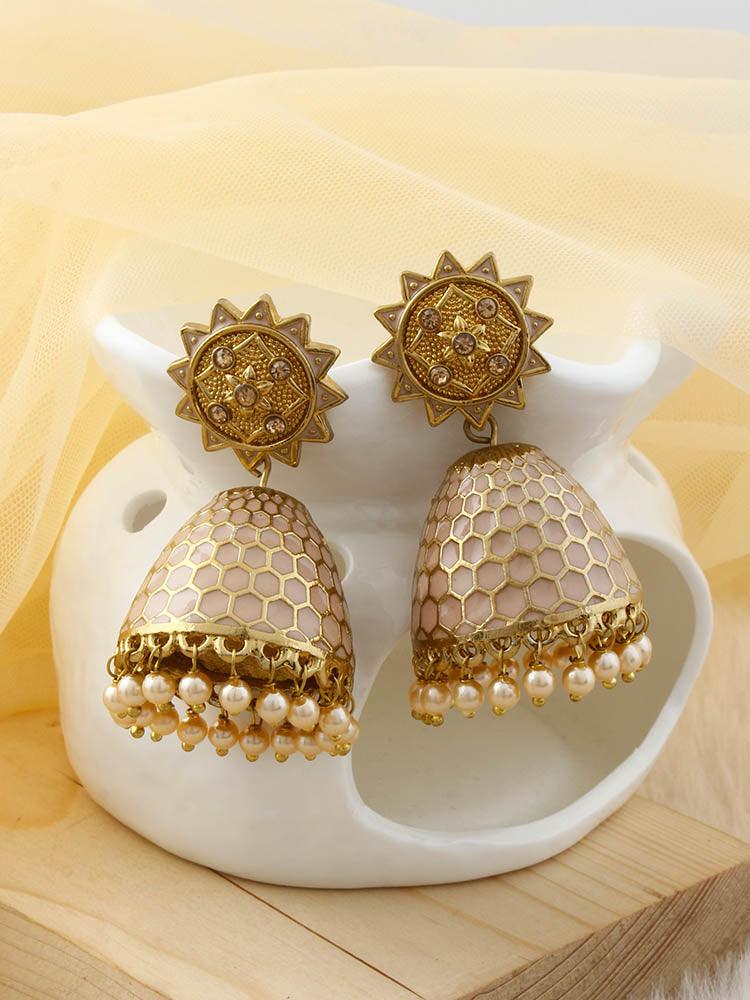 Traditional jhumki earrings with a priceless charm and unique embellishment of stones, crystals and pearls! Just the right choice for every traditional outfit!