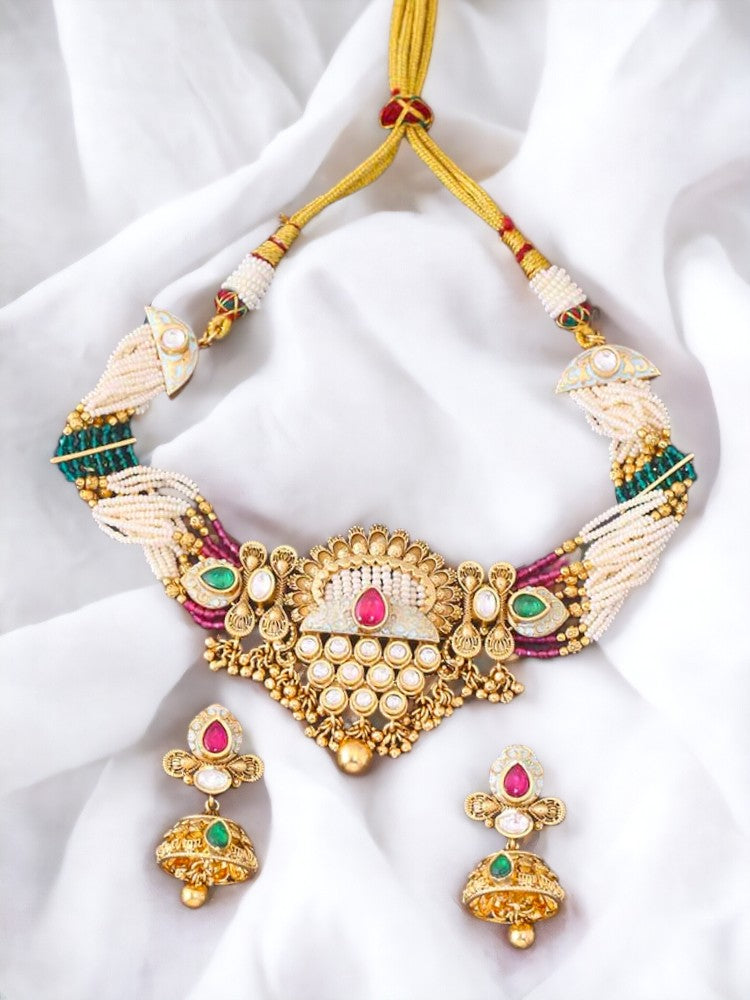 This necklace is the ultimate accessory option for the festive season. This set has a gorgeous circular floral pattern. The necklace has vibrant pearl detailing all over. The set also has a bright element of Kundan detailing in its structure. So, don't miss out on this gorgeous necklace set this eventful season as you have ramps to walk ahead.