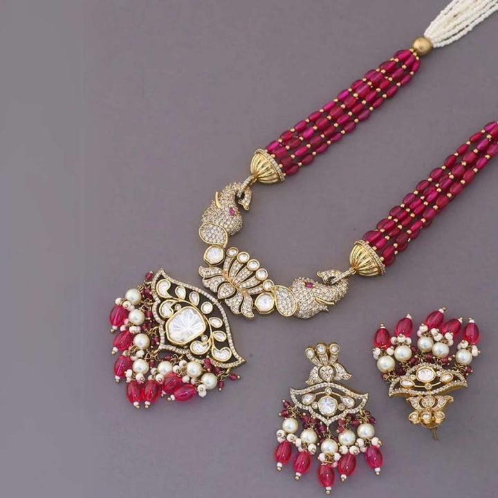 This necklace is the ultimate accessory option for the festive season. This set has a gorgeous circular floral pattern. The necklace has vibrant pearl detailing all over. The set also has a bright element of Kundan detailing in its structure. So, don't miss out on this gorgeous necklace set this eventful season as you have ramps to walk ahead.