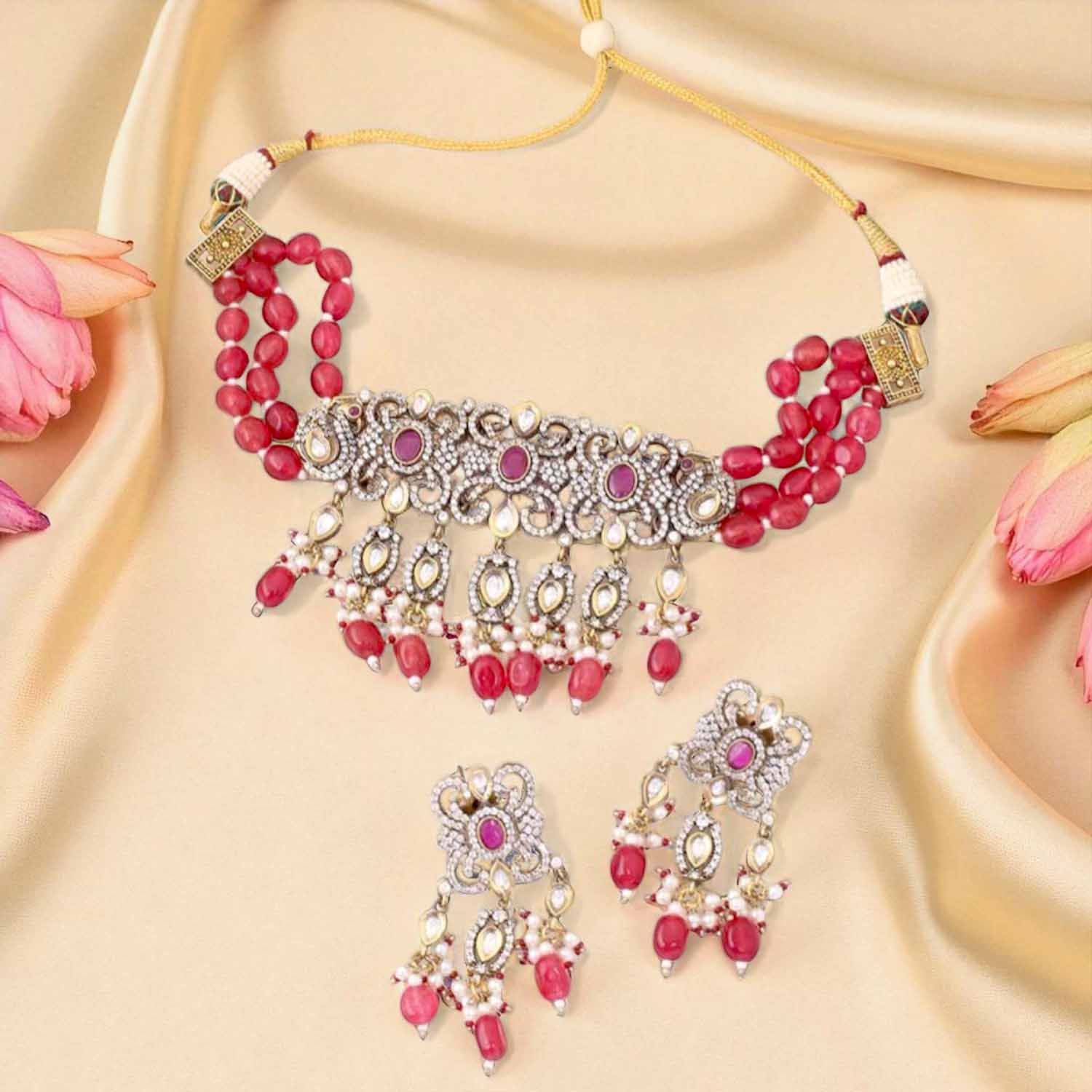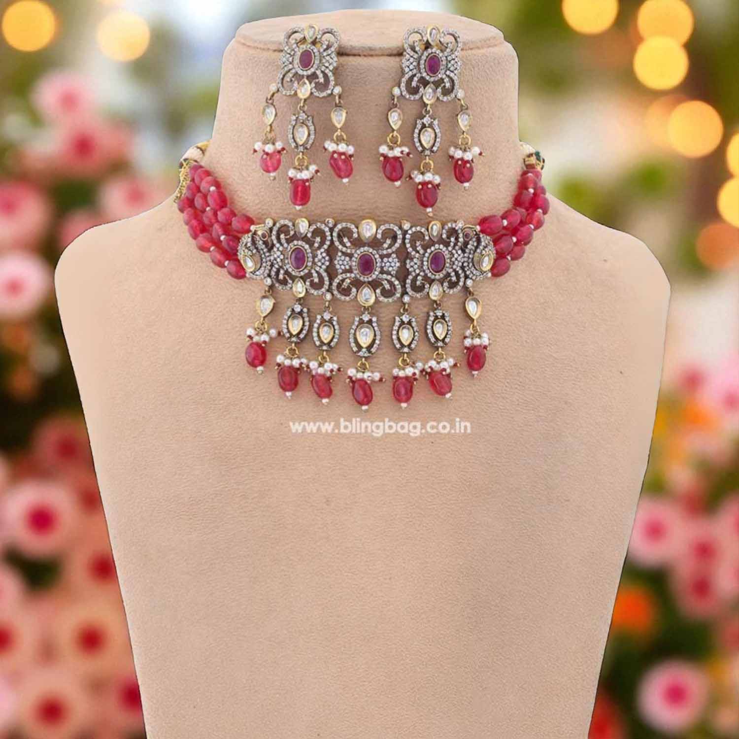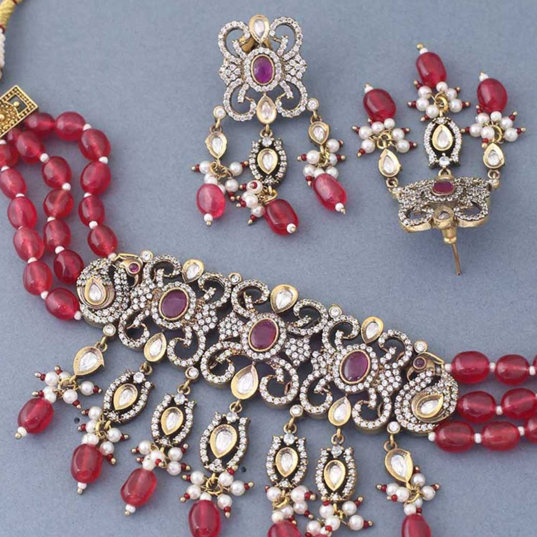 This necklace is the ultimate accessory option for the festive season. This set has a gorgeous circular floral pattern. The necklace has vibrant pearl detailing all over. The set also has a bright element of Kundan detailing in its structure. So, don't miss out on this gorgeous necklace set this eventful season as you have ramps to walk ahead.