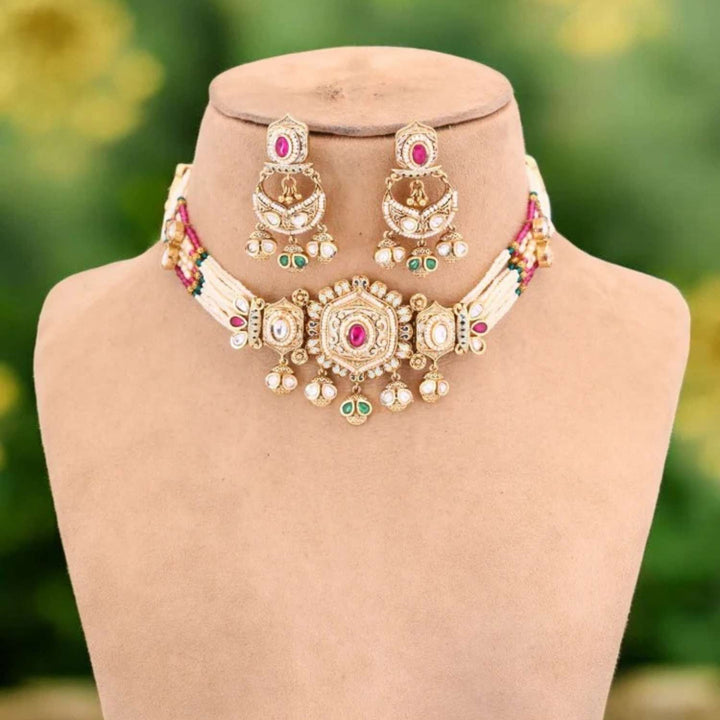 This necklace is the ultimate accessory option for the festive season. This set has a gorgeous circular floral pattern. The necklace has vibrant pearl detailing all over. The set also has a bright element of Kundan detailing in its structure. So, don't miss out on this gorgeous necklace set this eventful season as you have ramps to walk ahead.