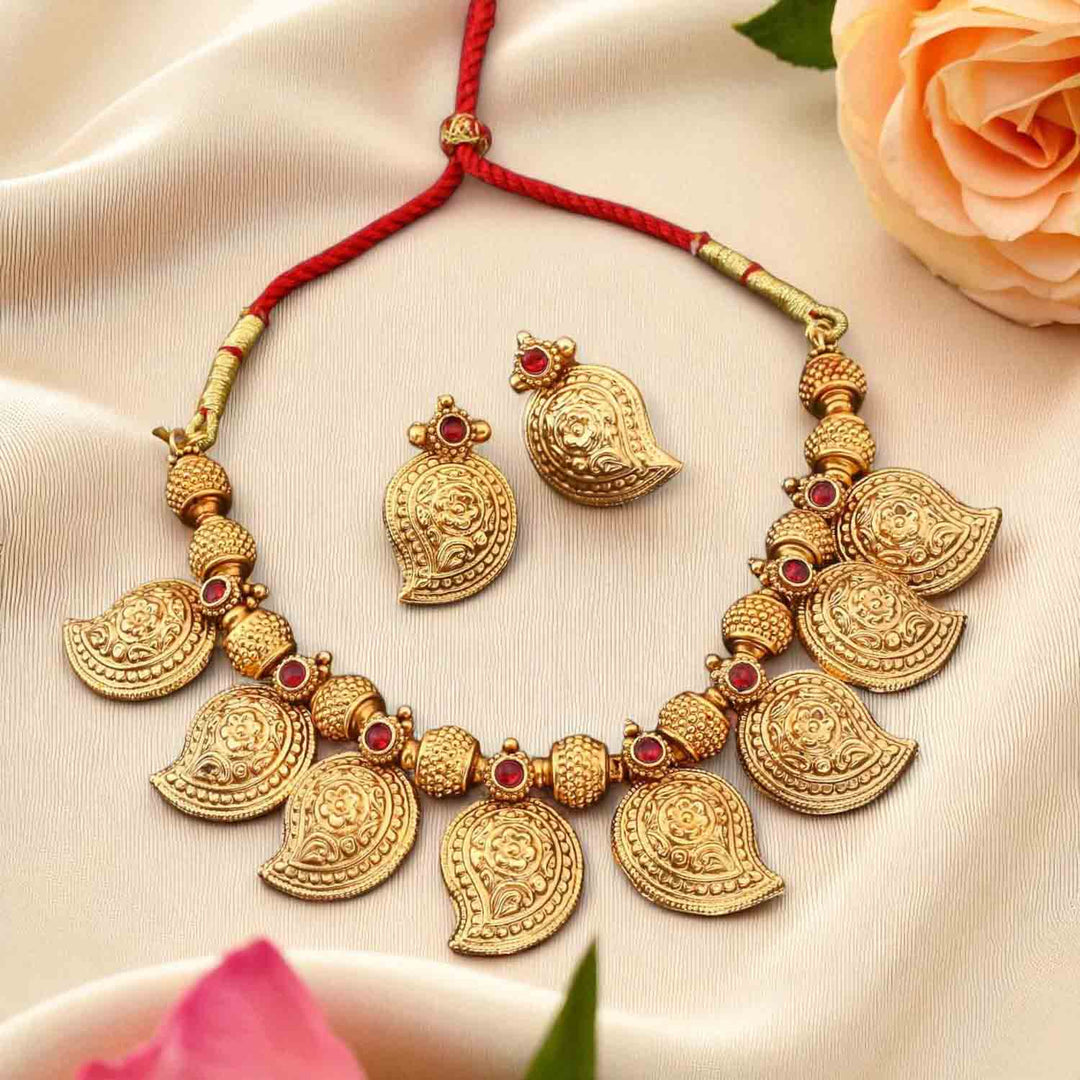 This is an antique and bold looking necklace with the reminiscence of Godly figures to give it the ethnic and traditional Indian touch.