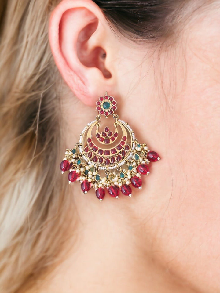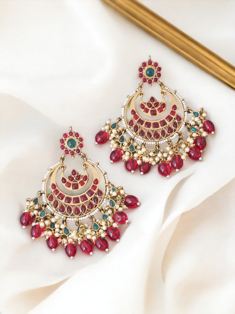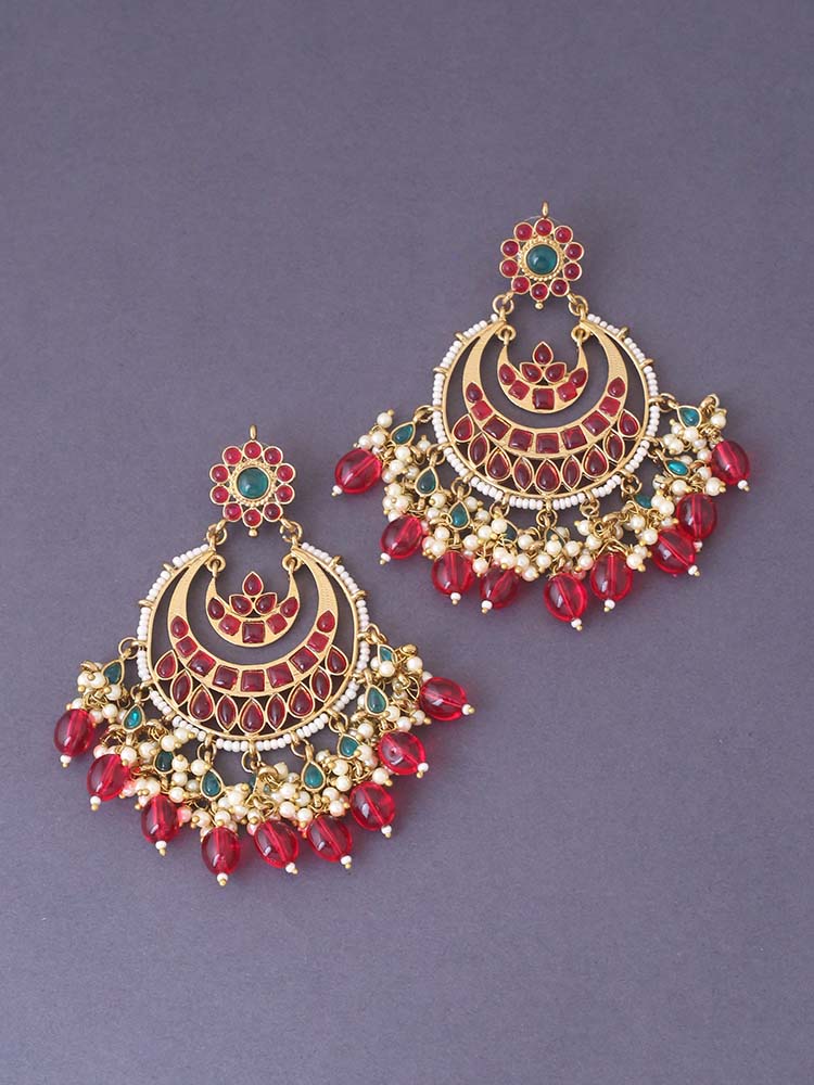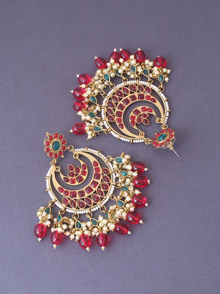 this gorgeous pair has a Chaandbali motif and contrasted kundan motifs and the added beautification of pearls, the earrings feature a contrasted look, the dangler design makes it the best way to channel your inner diva through jewellery