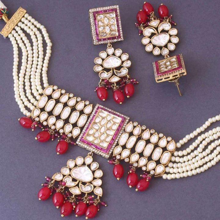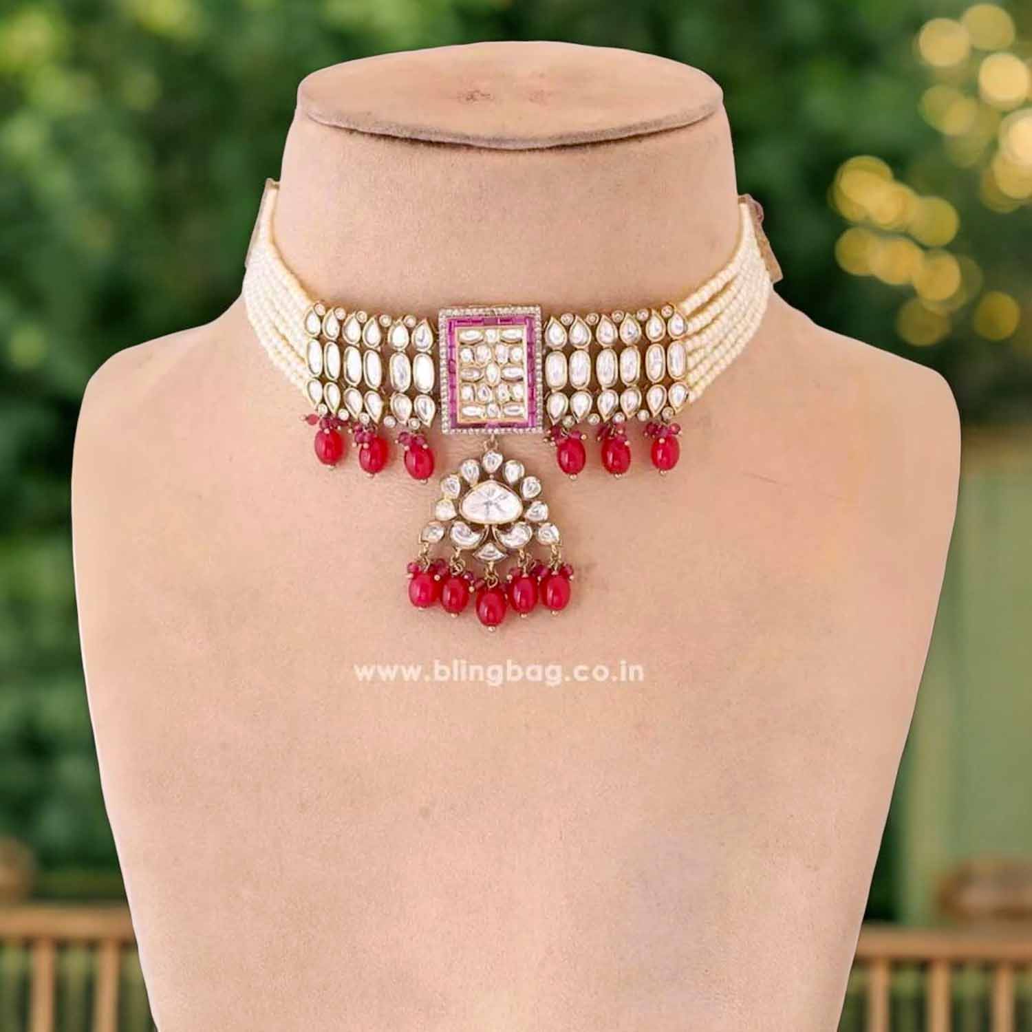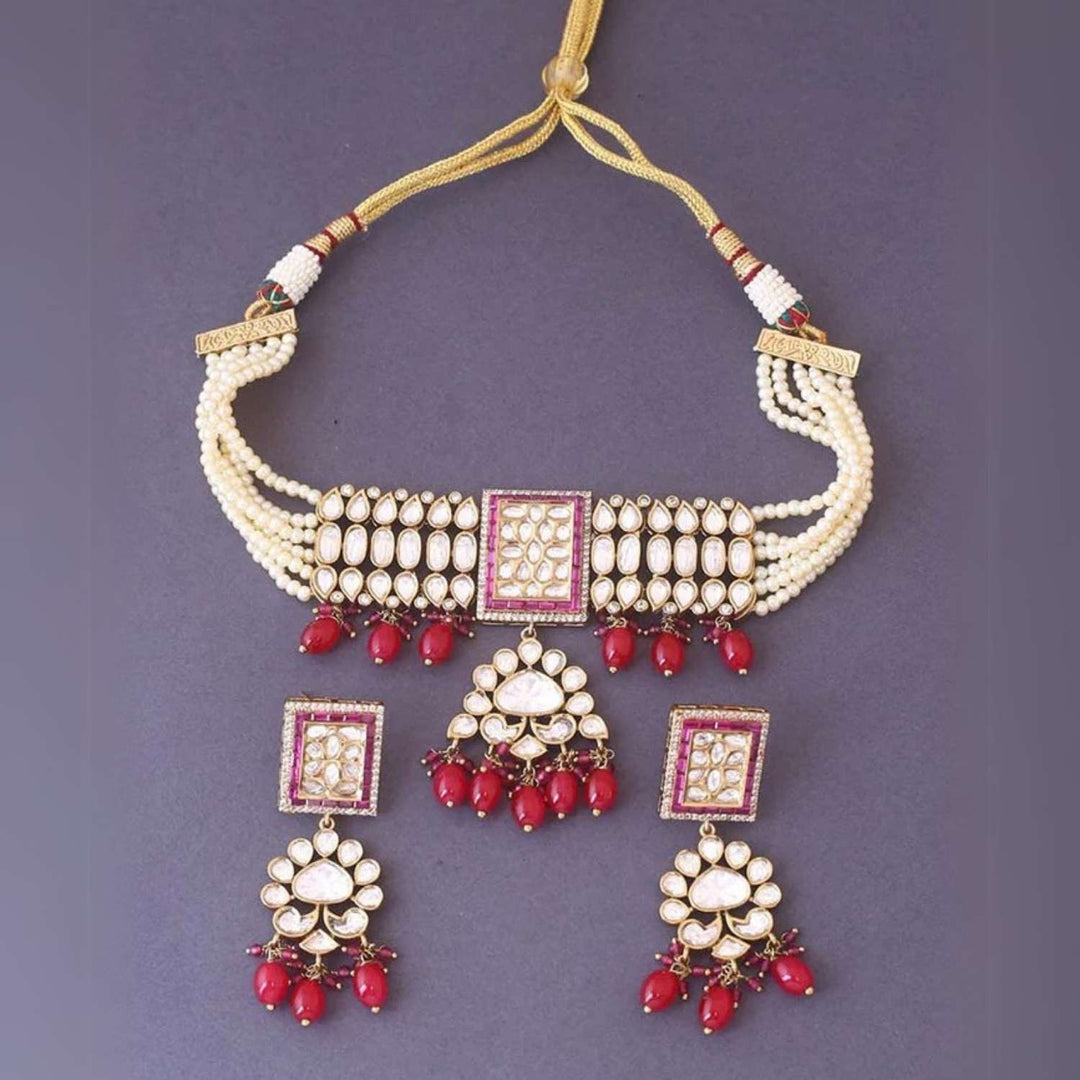 This necklace is the ultimate accessory option for the festive season. This set has a gorgeous circular floral pattern. The necklace has vibrant pearl detailing all over. The set also has a bright element of Kundan detailing in its structure. So, don't miss out on this gorgeous necklace set this eventful season as you have ramps to walk ahead.