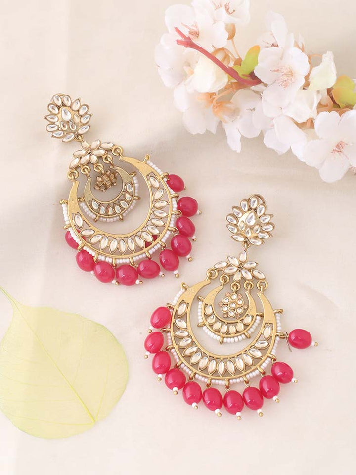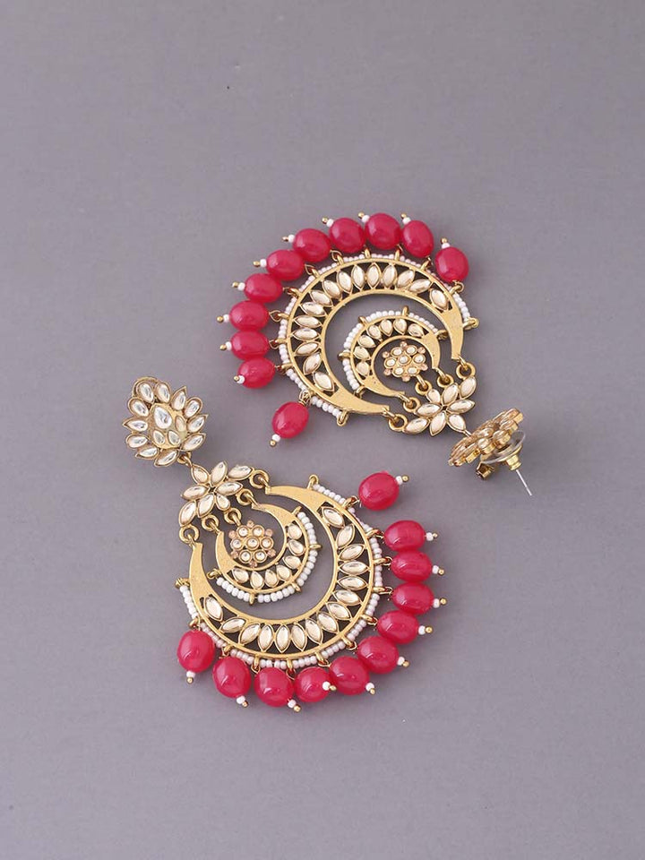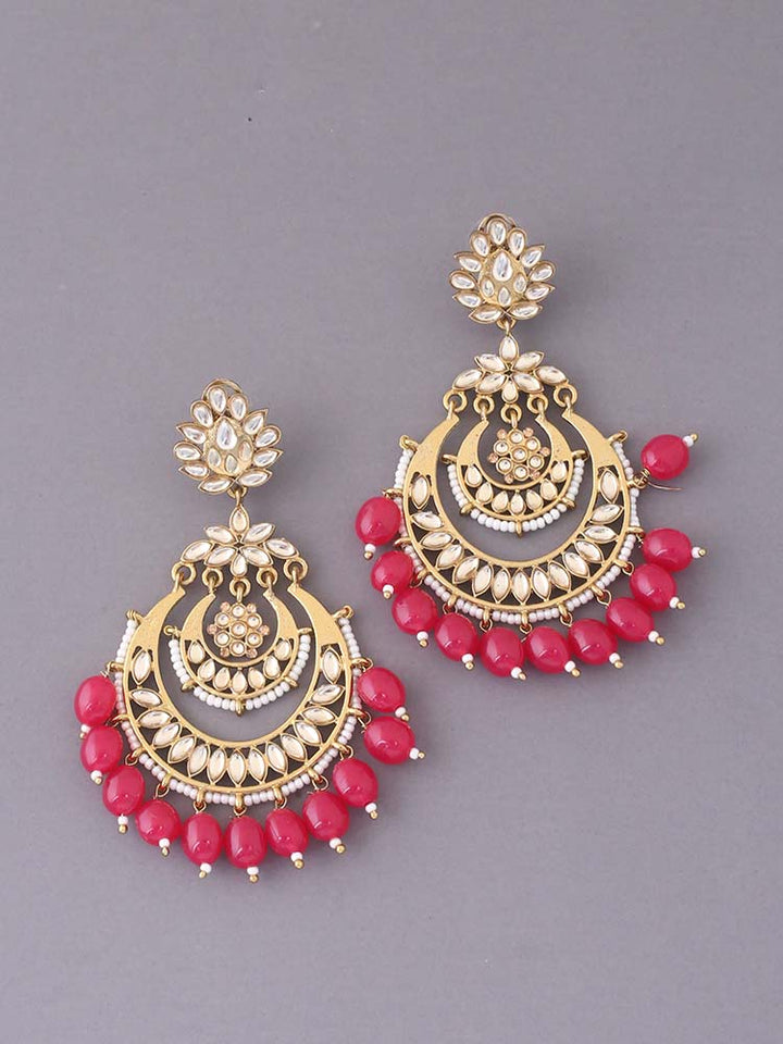 The beautiful designer chaandbali drops make this piece a stunner. The added gorgeous detailing of kundans and beads give it an elevated stylish look. The tiered structure of the earrings are also another unique part of this piece. So this piece is a must have in the festive season.
