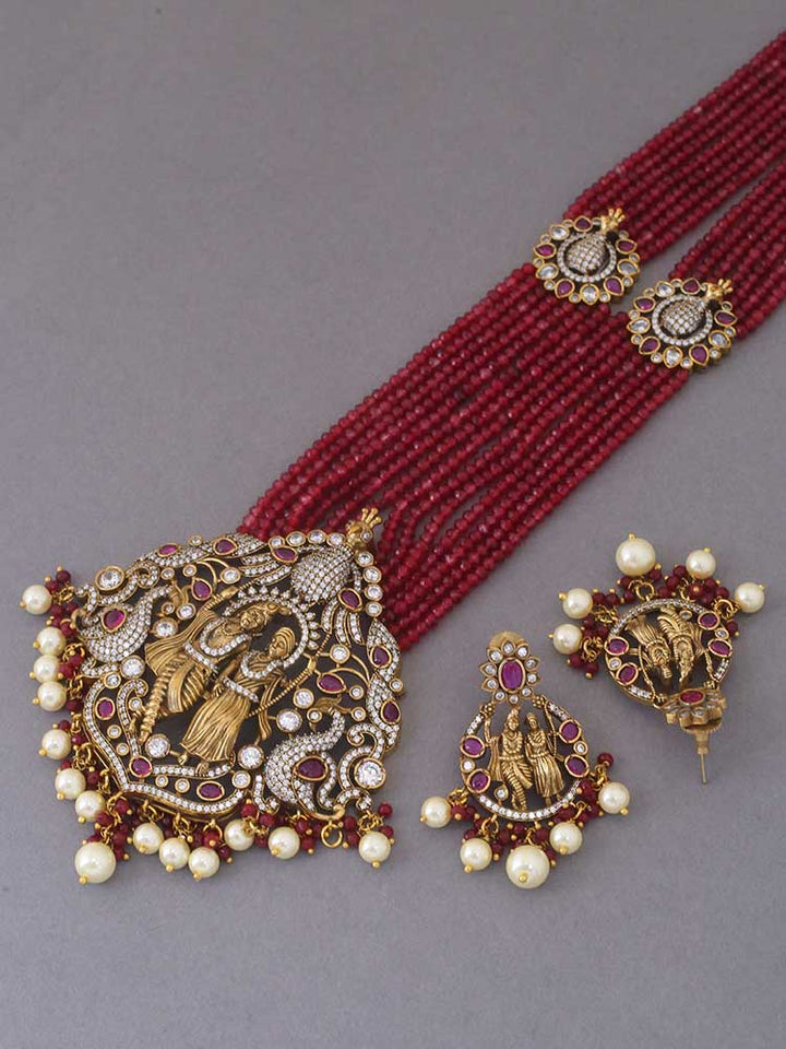 This necklace is the ultimate accessory option for the festive season. This set has a gorgeous circular floral pattern. The necklace has vibrant pearl detailing all over. The set also has a bright element of Kundan detailing in its structure. So, don't miss out on this gorgeous necklace set this eventful season as you have ramps to walk ahead.